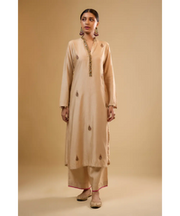 This 2 piece kurta set comes with sequins, mirror and zardosi embroidery on the collar and kurta patti. It is enhanced with contrast applique motifs with mirror and zardosi embroidery all over the kurta. It is paired with palazzo pants.  Optional embroidered dupatta available on request.