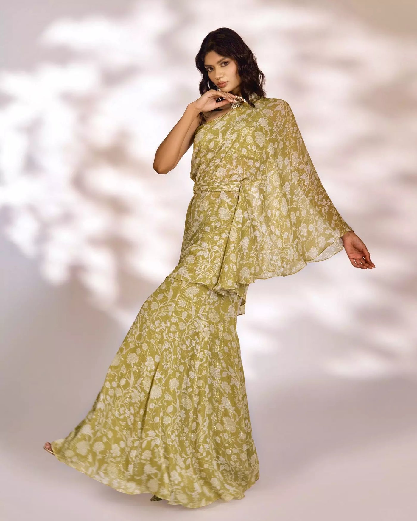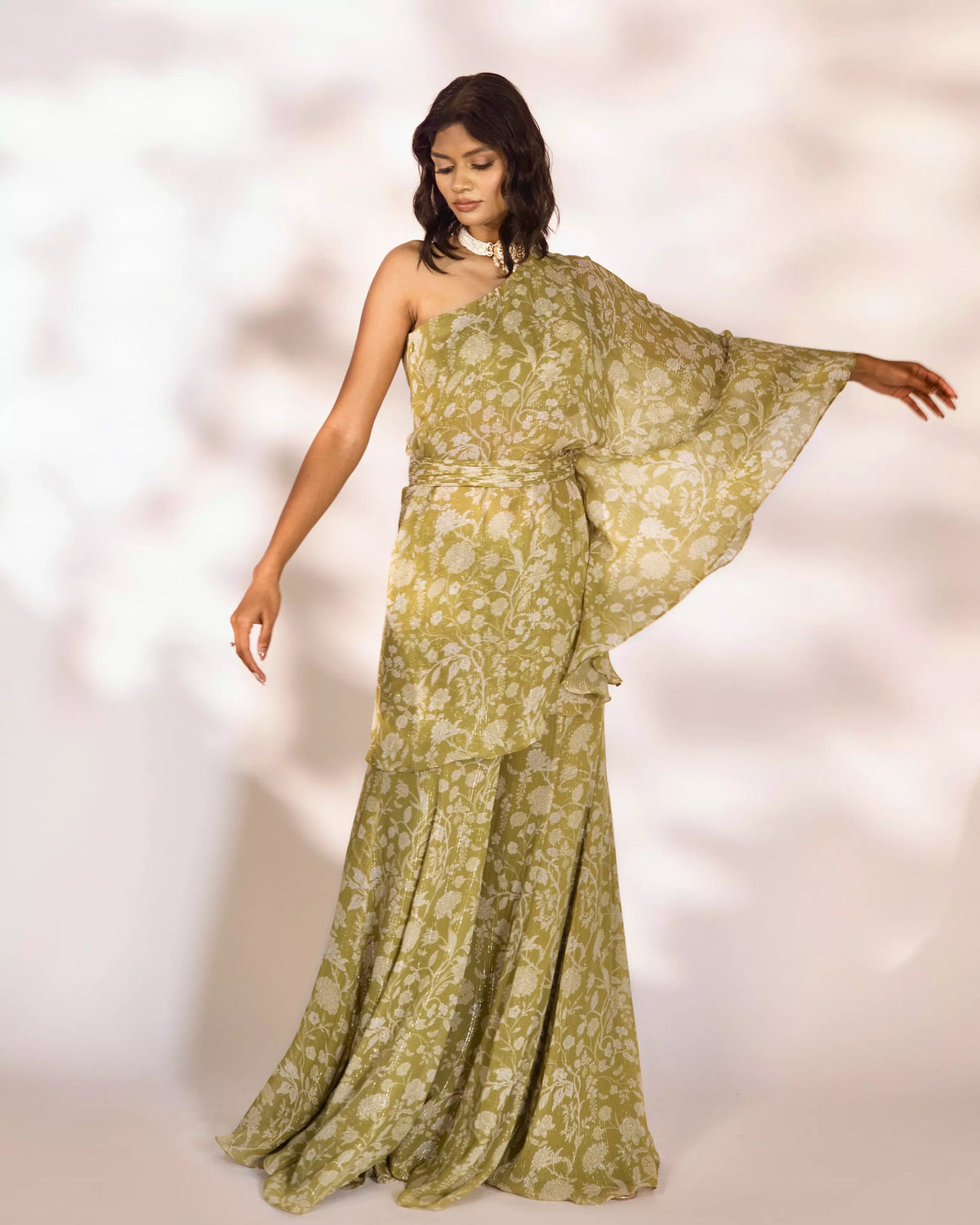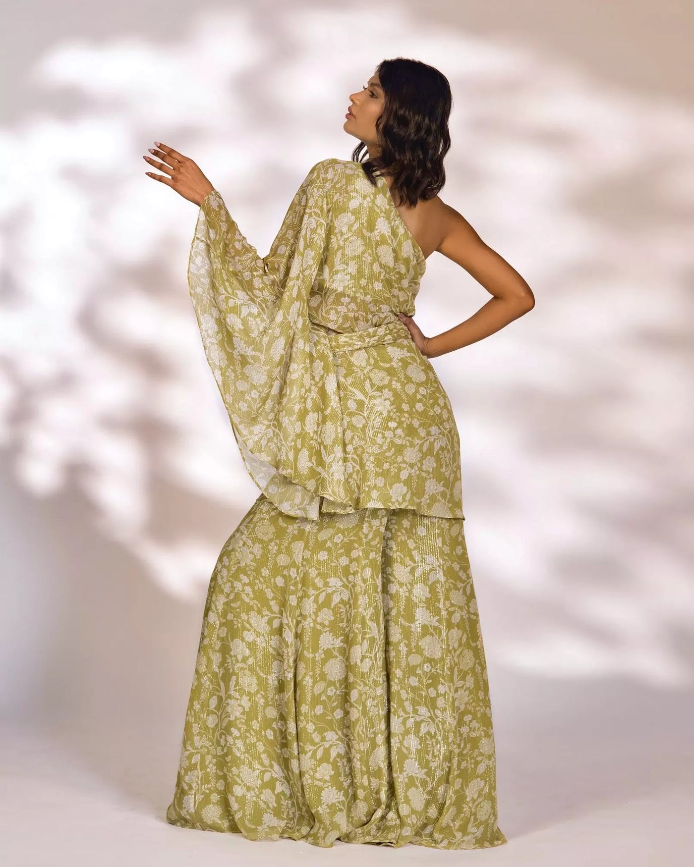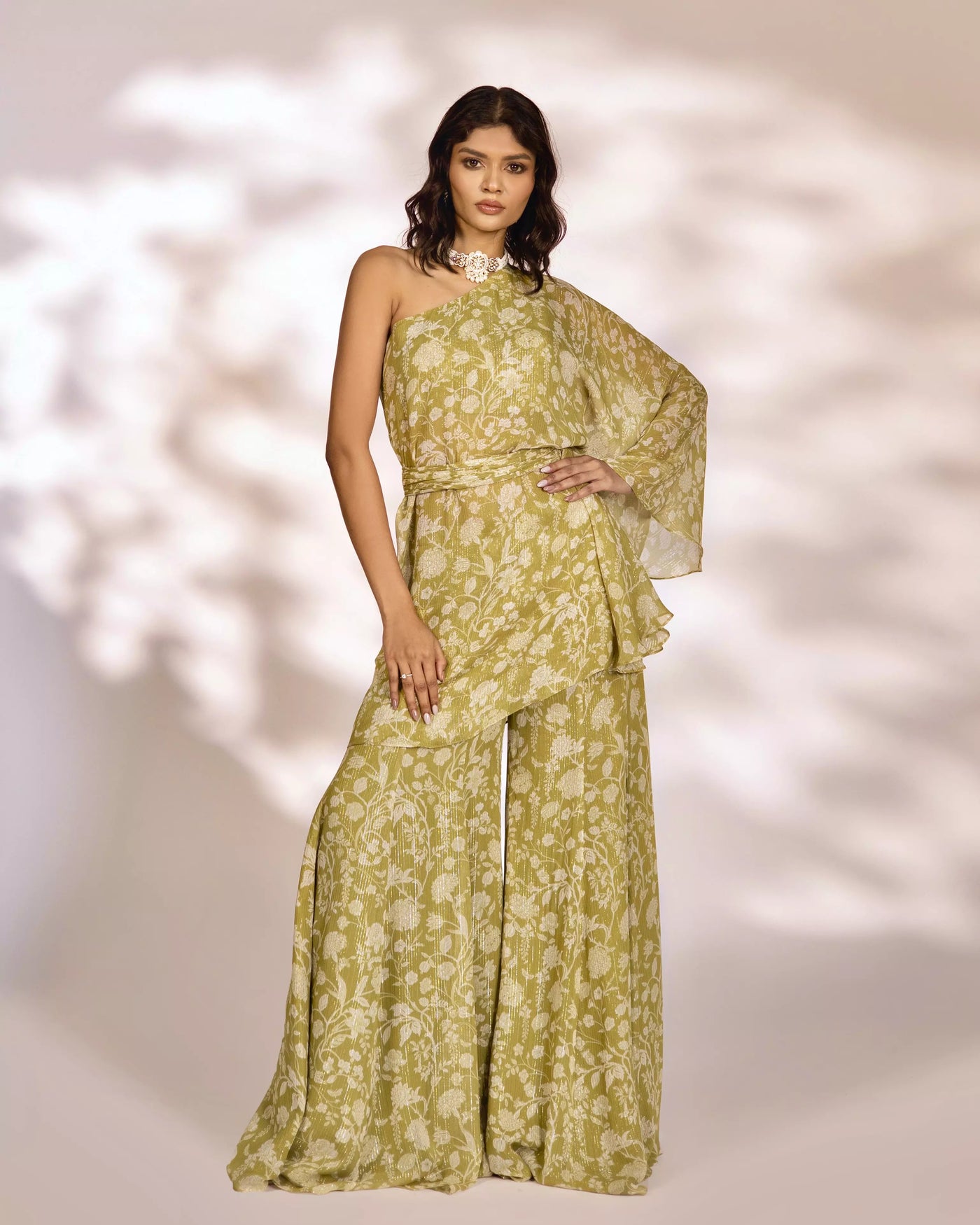 Composition - Green cape top and pant set with ruched belt - Lurex Georgette