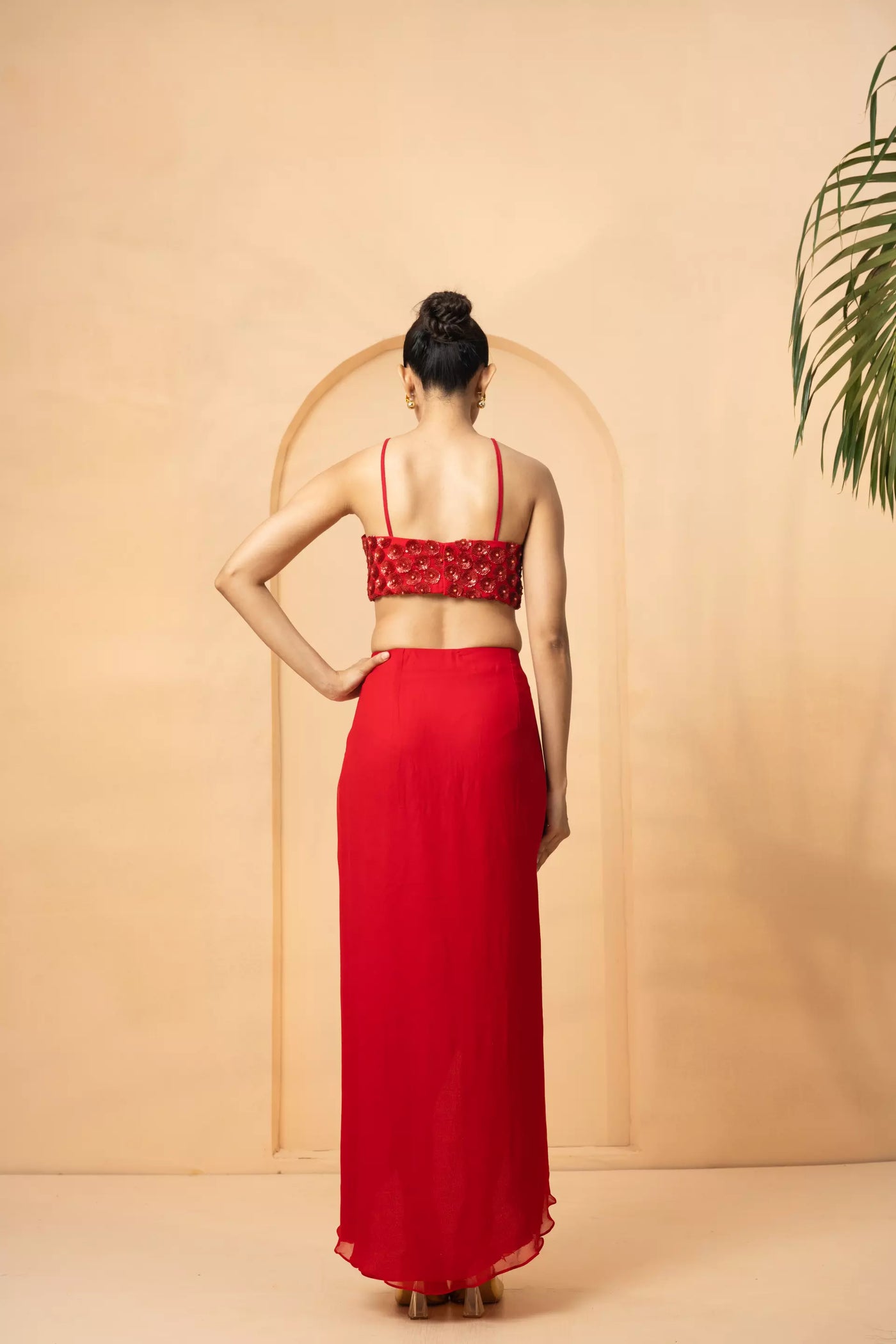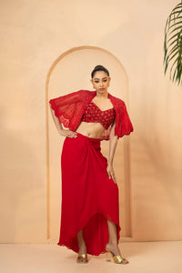 Featuring a red co-ord set which contains a blouse, cape and a dhoti skirt. The blouse and cape is fully hand-embroidered with pearl beads, cutdana,, anchor thread and sequin work