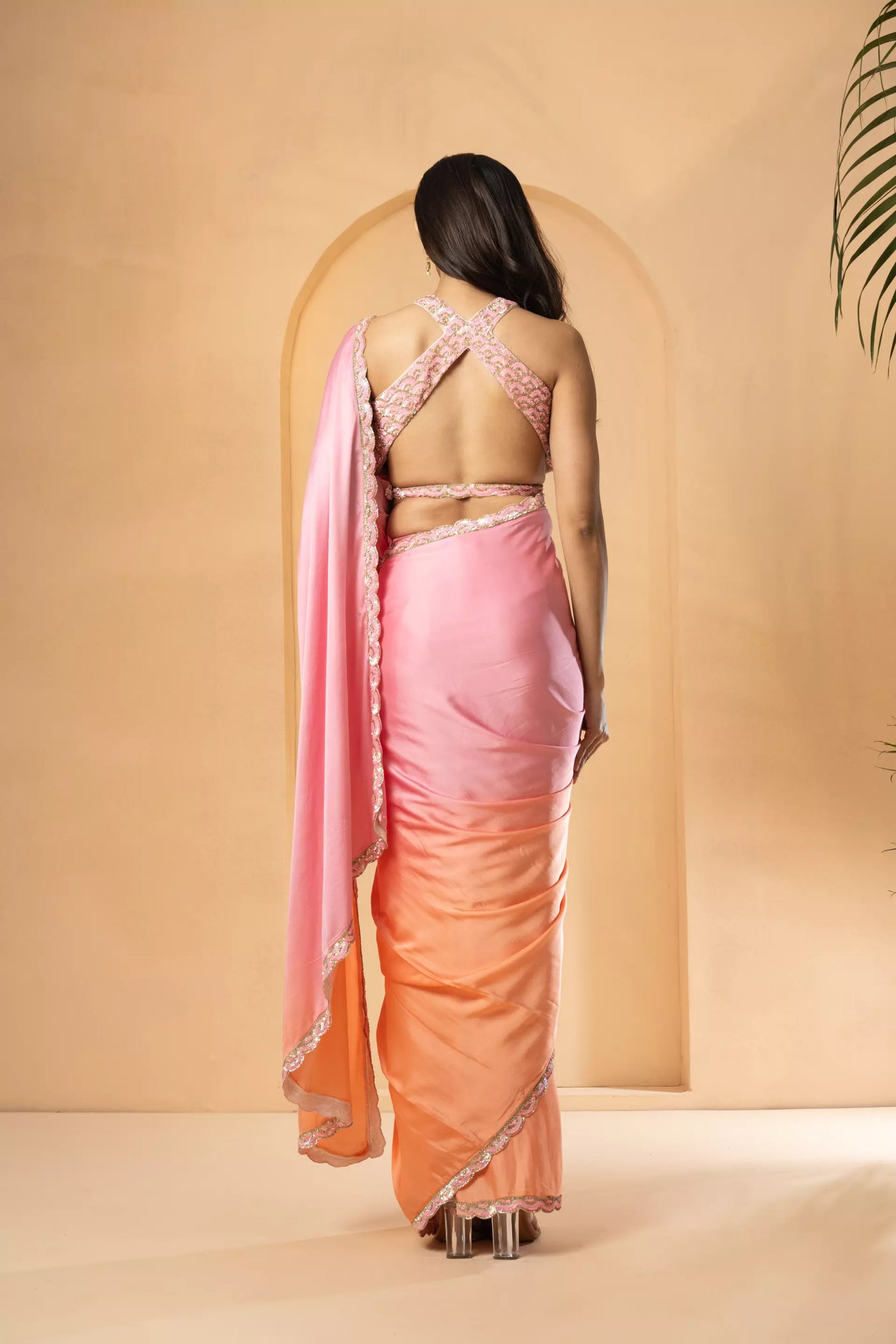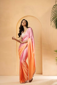 Featuring a pink, peach ombre pre-stitched drape saree, made of modal satin fabric, with intricate sewuin work on blouse and border of the saree.