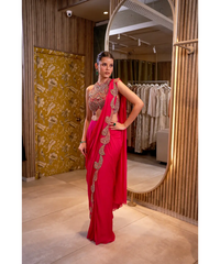 The Parizaad Saree Set is a tribute to exquisite drapery. The saree, bordered with fine details, is paired with a heavily embellished blouse. The blend of organza and chiffon flows beautifully, offering a couture experience that captures poetic elegance and timeless beauty.