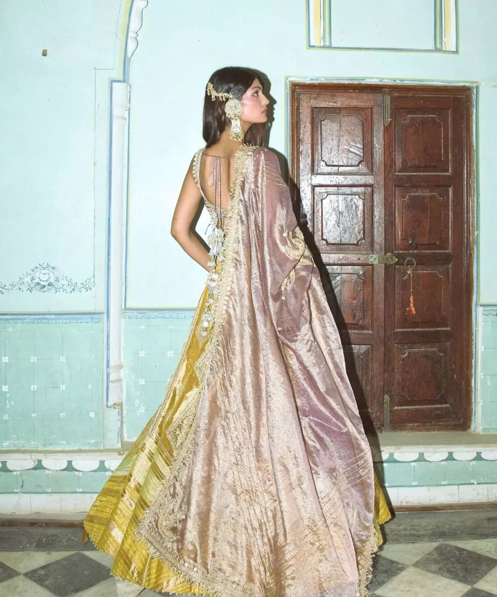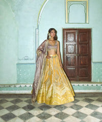 ADITI GUPTA - Mustard Yellow Zari tissue with Lilac tissue dupatta Lehenga Set