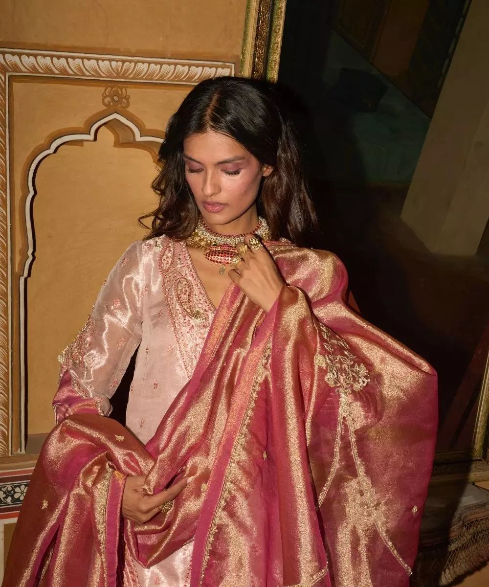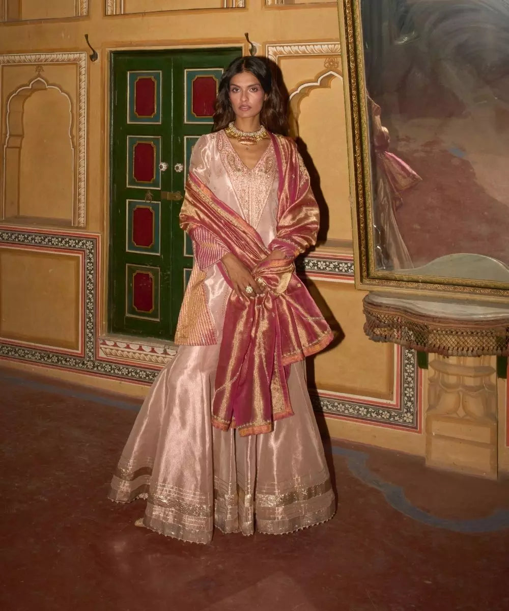 ADITI GUPTA - Rose Gold short Kurta with Sharara and Hot pink dupatta in silk zari tissue - XS