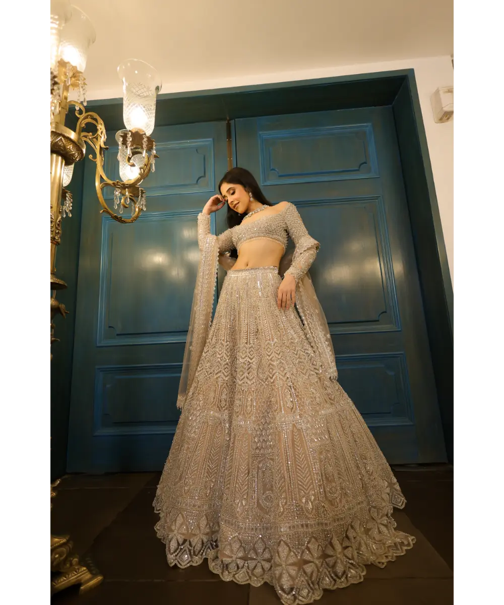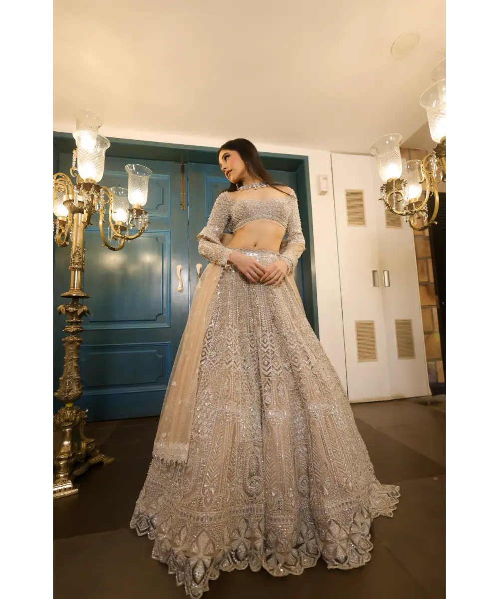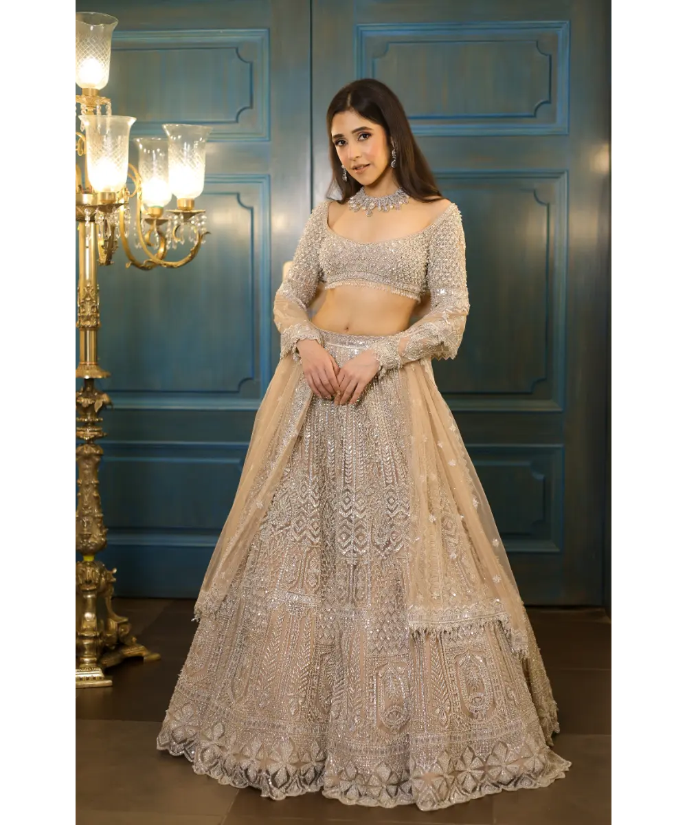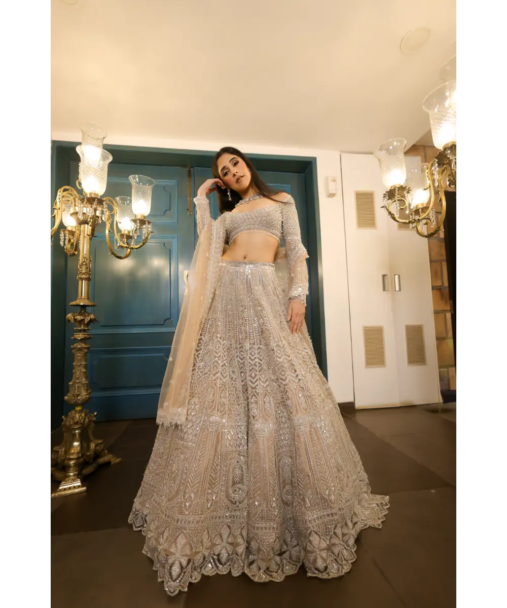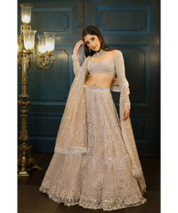 Featuring a nude lehenga in net base with sequins, crystal and cutdana embroidery. It is paired with a blouse having tassels detailing and an embroidered dupatta Accentuate with statement jewellery and heels for a wedding, sangeet or cocktail ceremony.