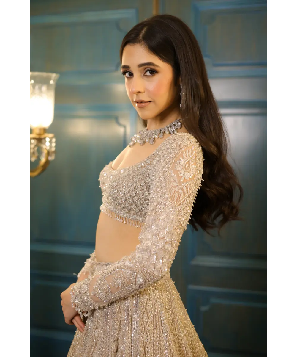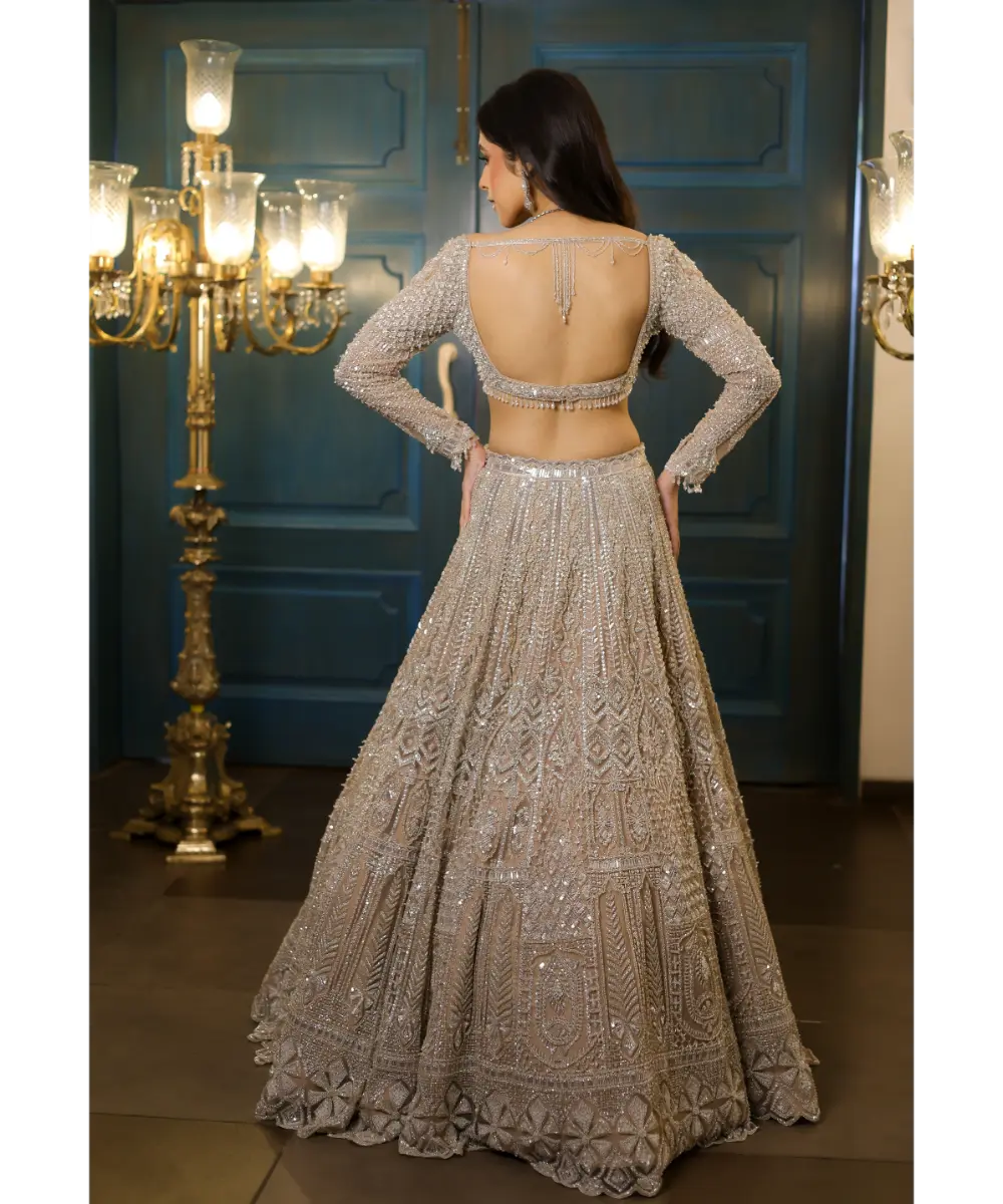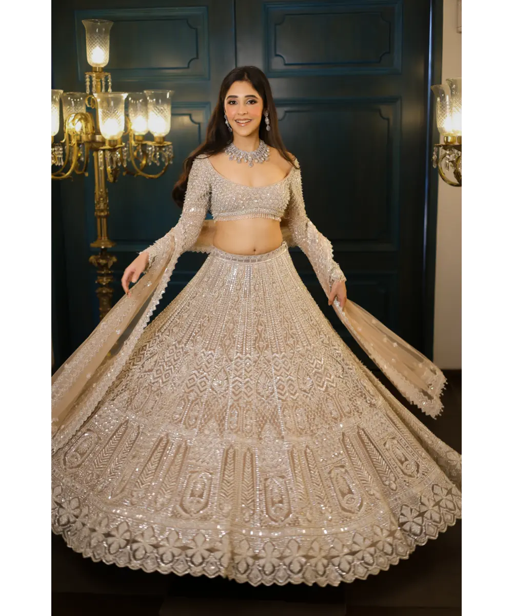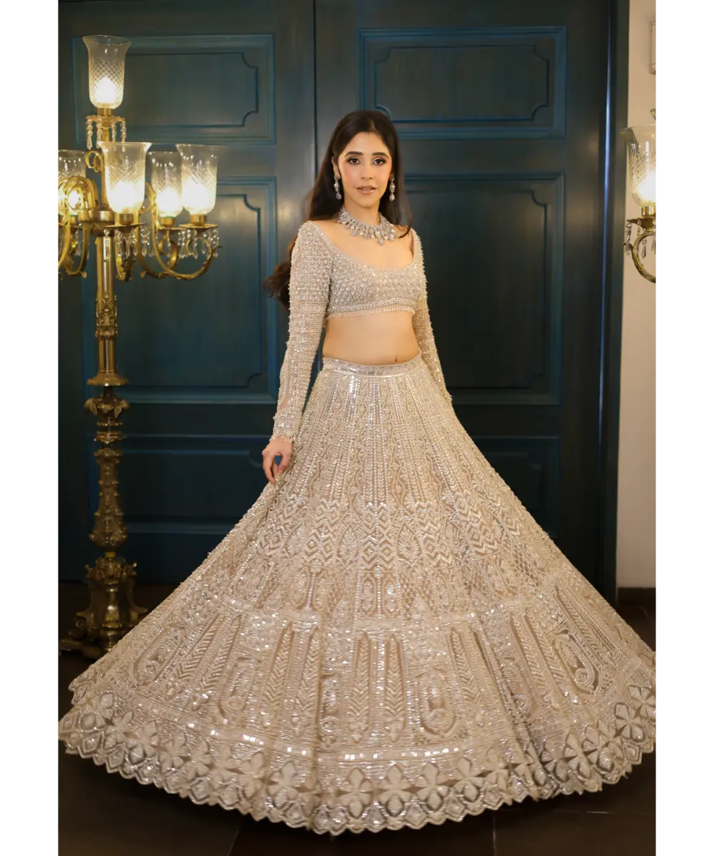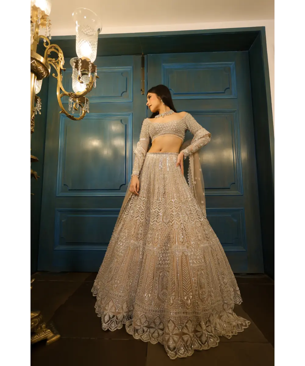 Featuring a nude lehenga in net base with sequins, crystal and cutdana embroidery. It is paired with a blouse having tassels detailing and an embroidered dupatta Accentuate with statement jewellery and heels for a wedding, sangeet or cocktail ceremony.