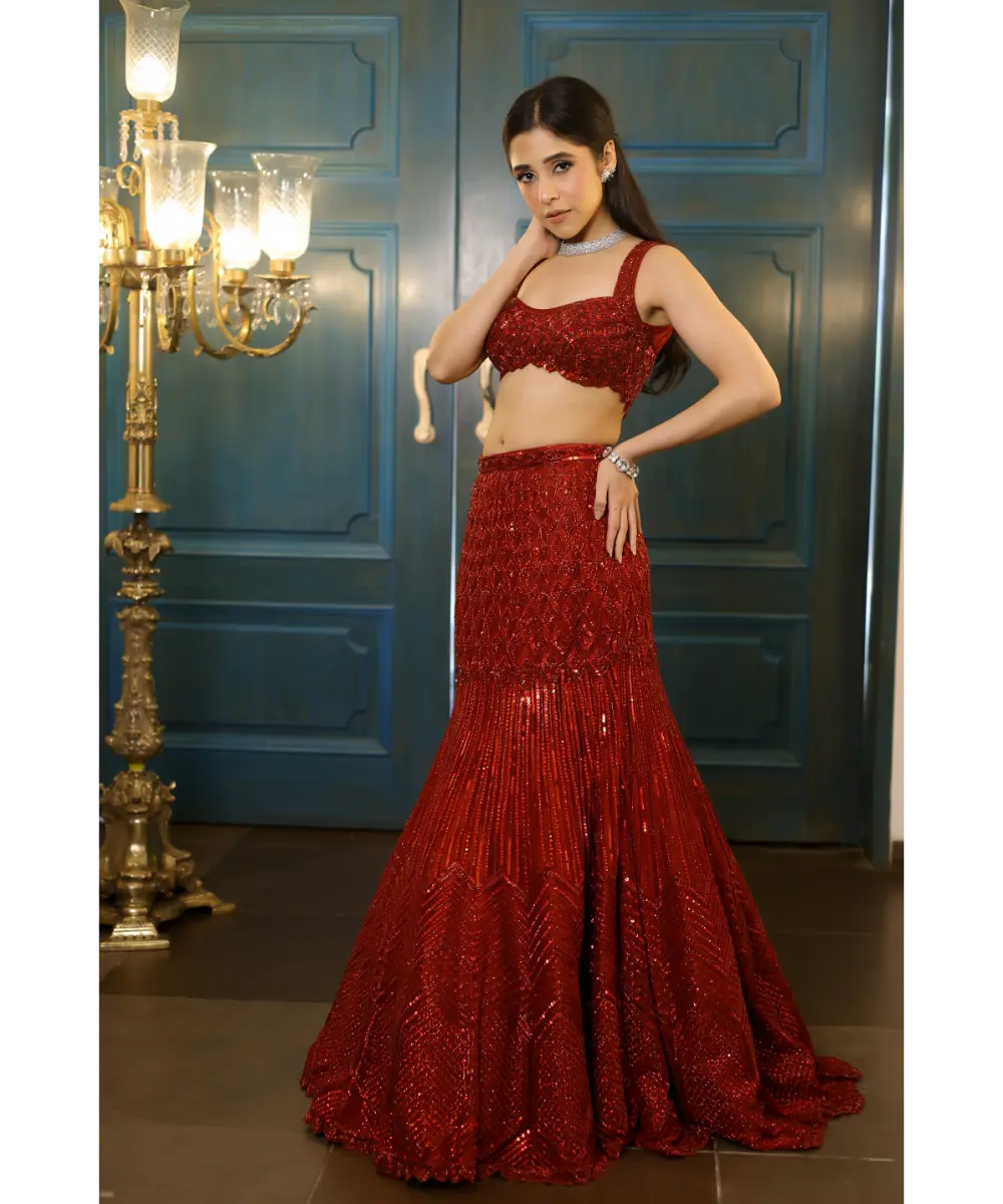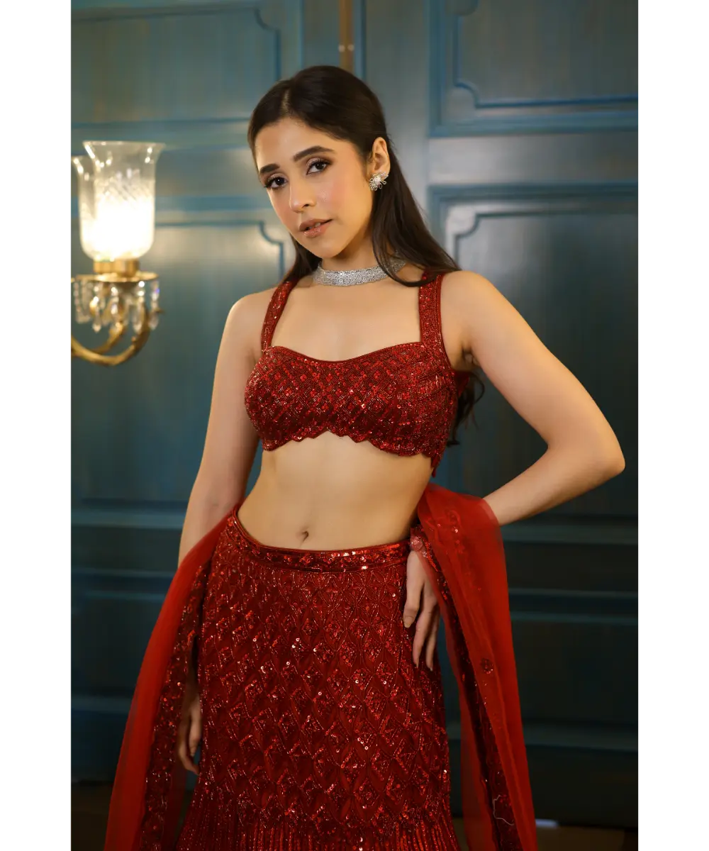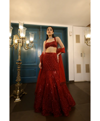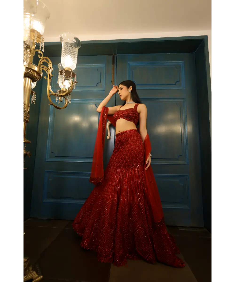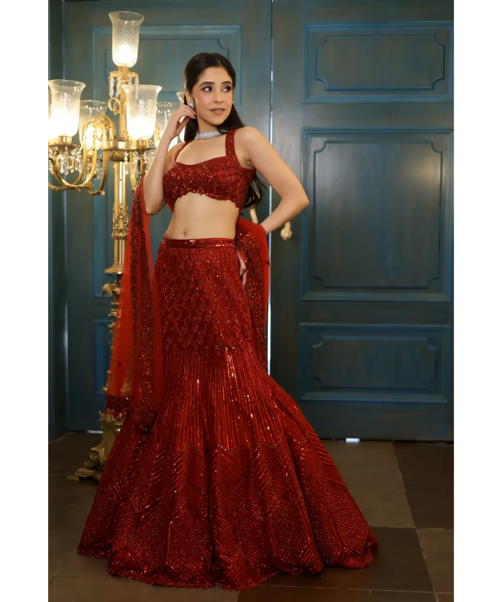 Featuring a red fish-cut lehenga in net base with sequins, cutdana and crystal embellishments. It is paired with an embroidered strappy blouse and a dupatta Accentuate with statement jewellery and heels for a wedding, sangeet or cocktail ceremony.