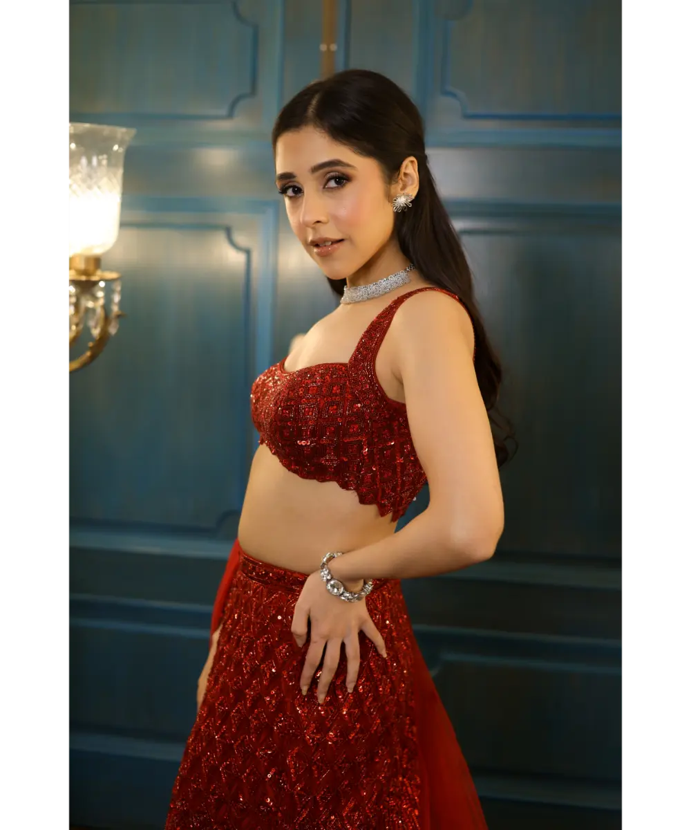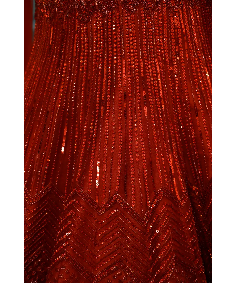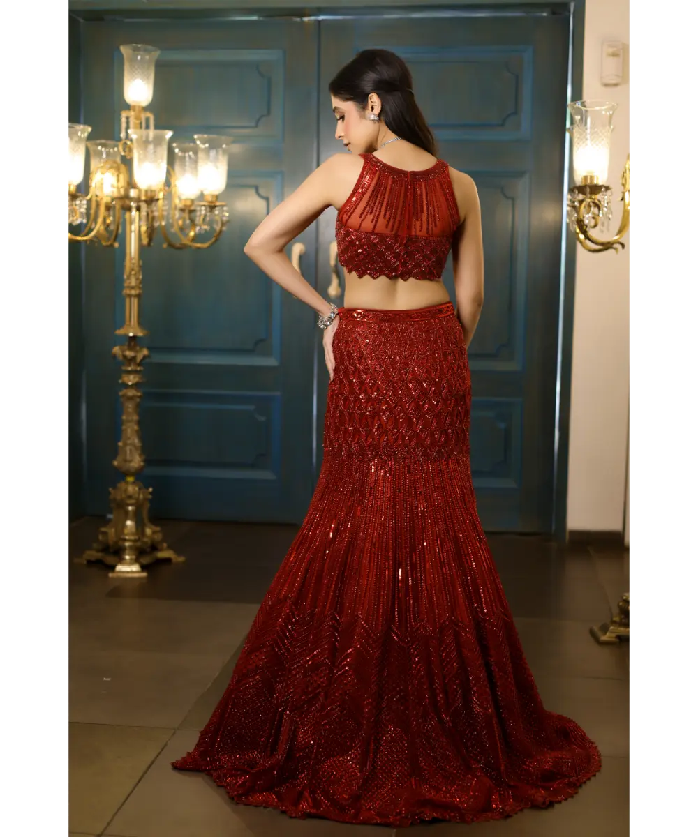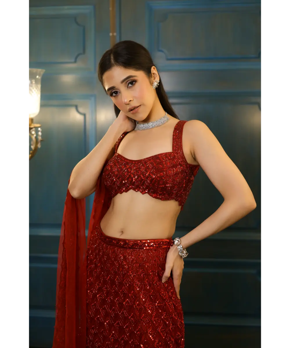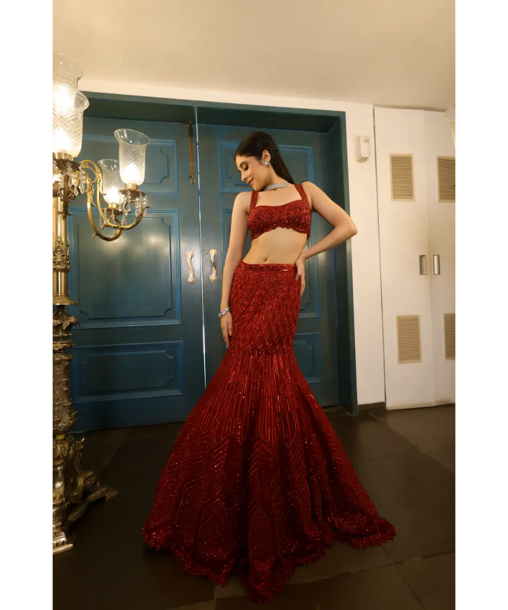 Featuring a red fish-cut lehenga in net base with sequins, cutdana and crystal embellishments. It is paired with an embroidered strappy blouse and a dupatta Accentuate with statement jewellery and heels for a wedding, sangeet or cocktail ceremony.