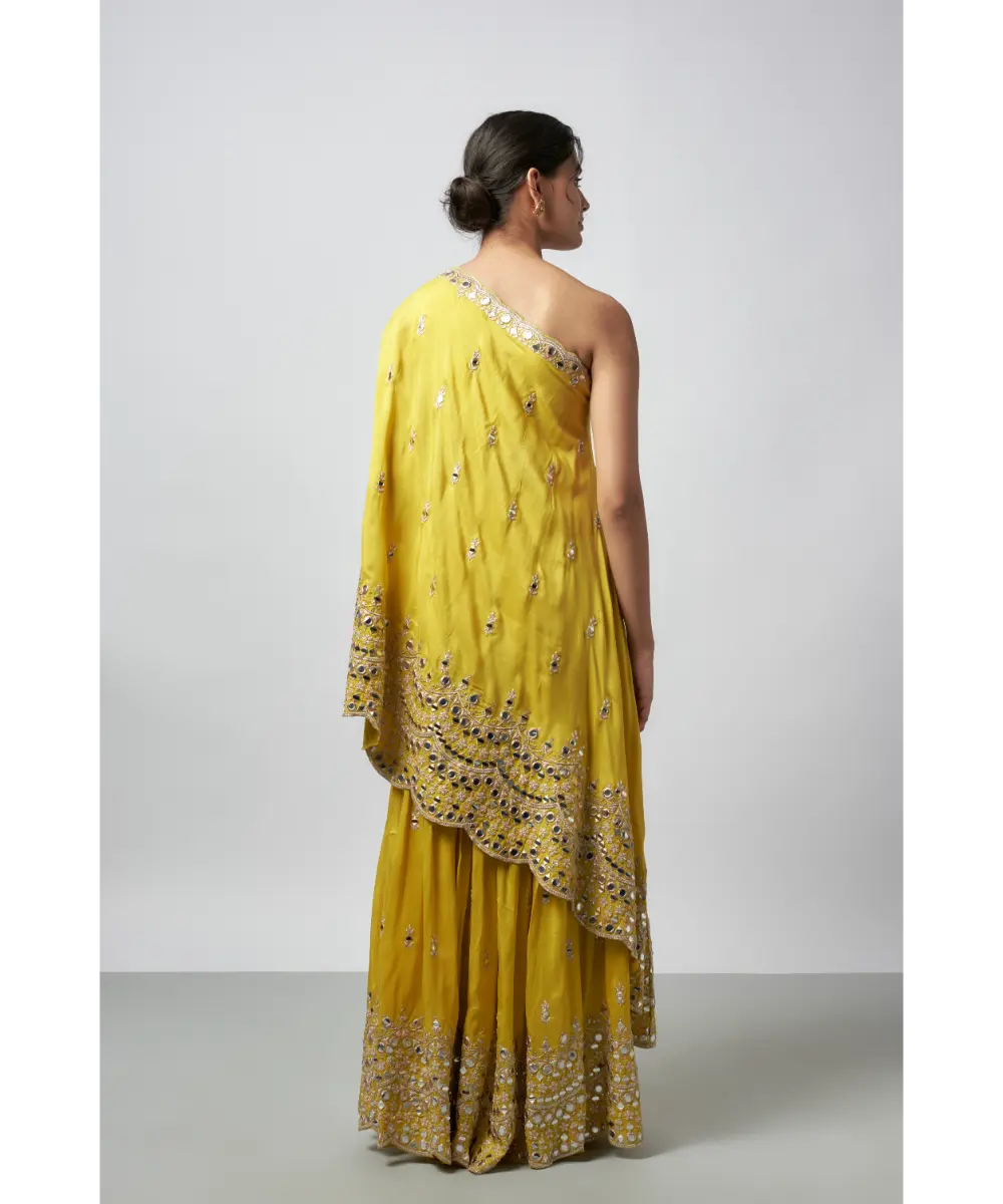This asymmetrical kurta features mirror work and intricate embroidery scattered throughout and a scalloped hemline with heavy embellishments. Paired with sharara showcasing similar embroidery along the hem.