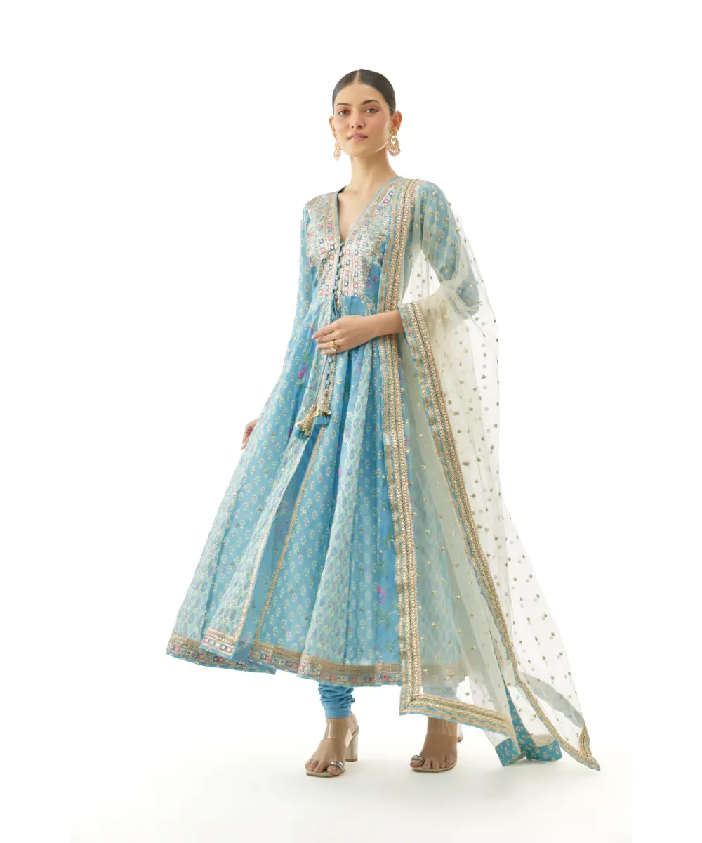 The long Anarkali kurta features intricate motifs throughout, enhanced by delicate hand-embroidered detailing along the neckline and hem. A deep V-neck and tie-up tassels add a modern flair to its traditional silhouette. Paired with matching churidar bottoms and a dupatta scattered with sequin embellishments and bordered with fine gota work.