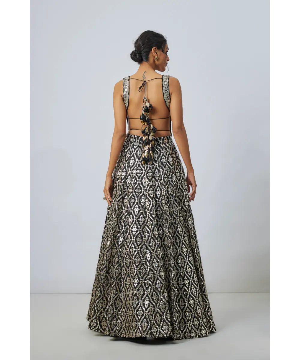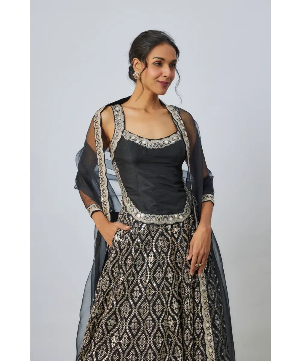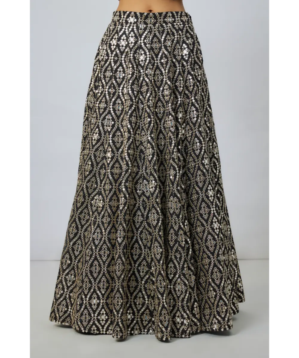 Featuring blouse with intricate embroidery along the neckline and straps. Paired with it is a voluminous lehenga adorned with mirror work and geometric patterns, creating a striking visual impact. The look is completed with a net dupatta, subtly embellished with accents for a graceful touch.