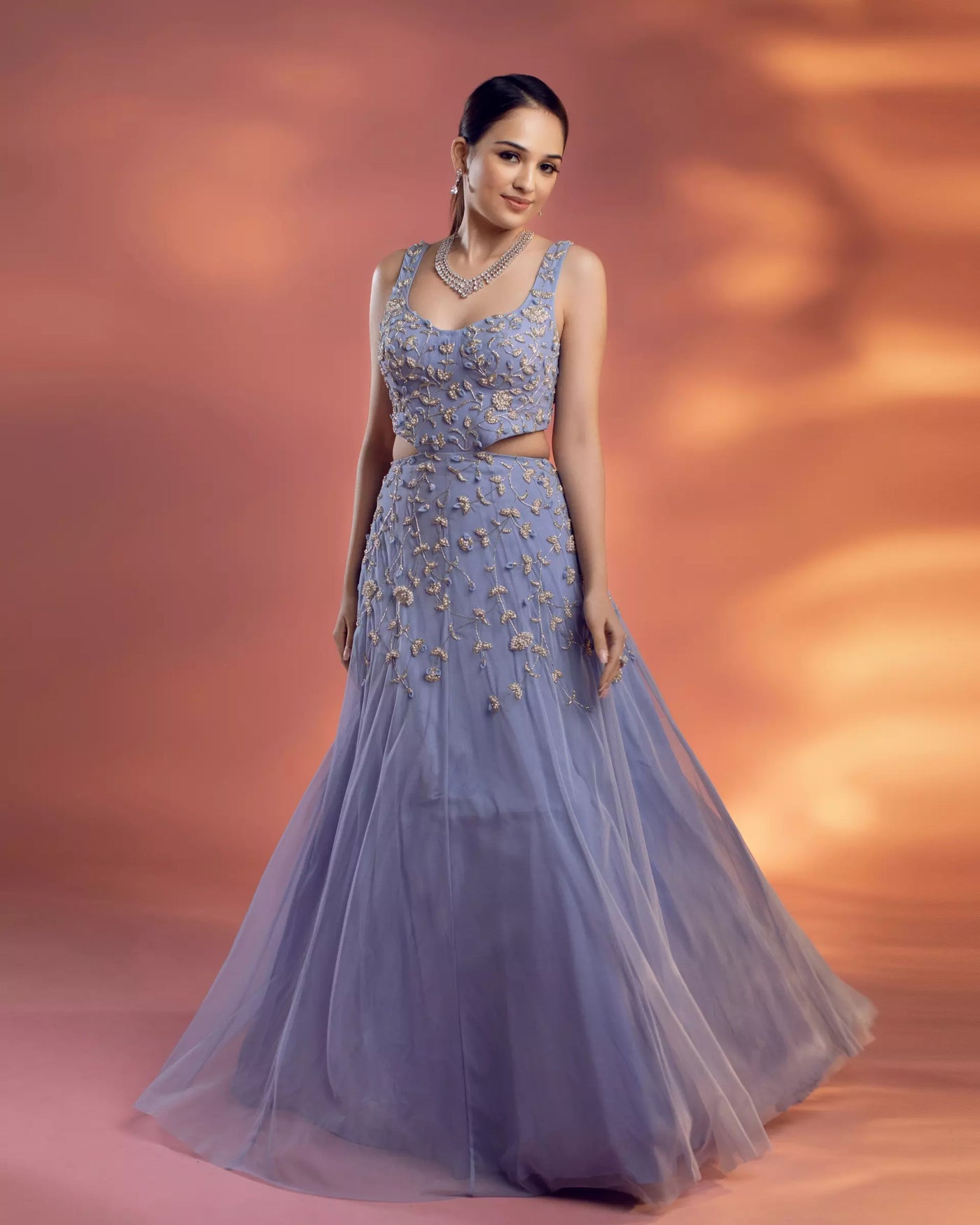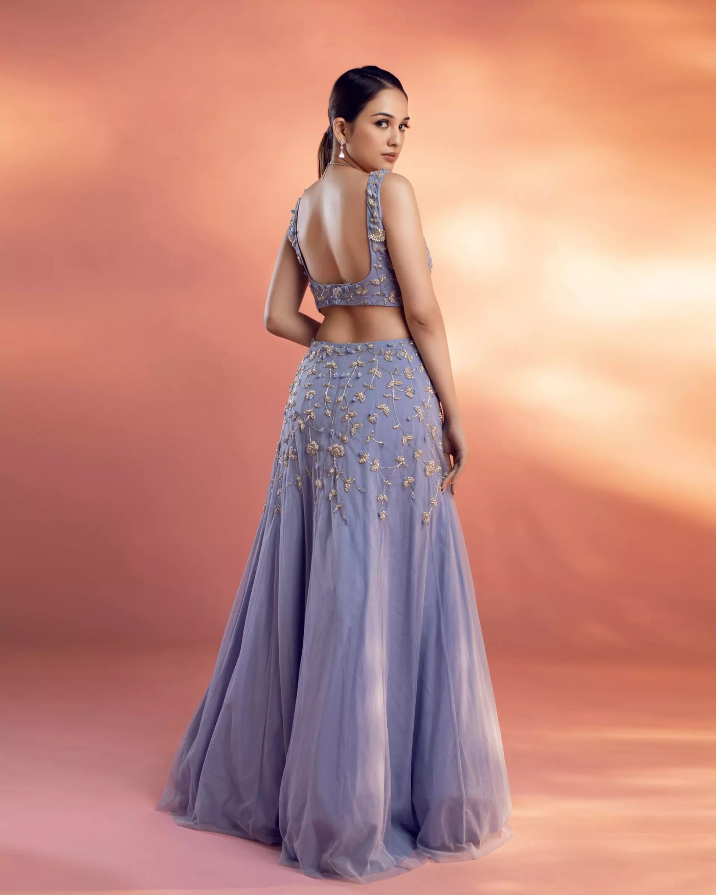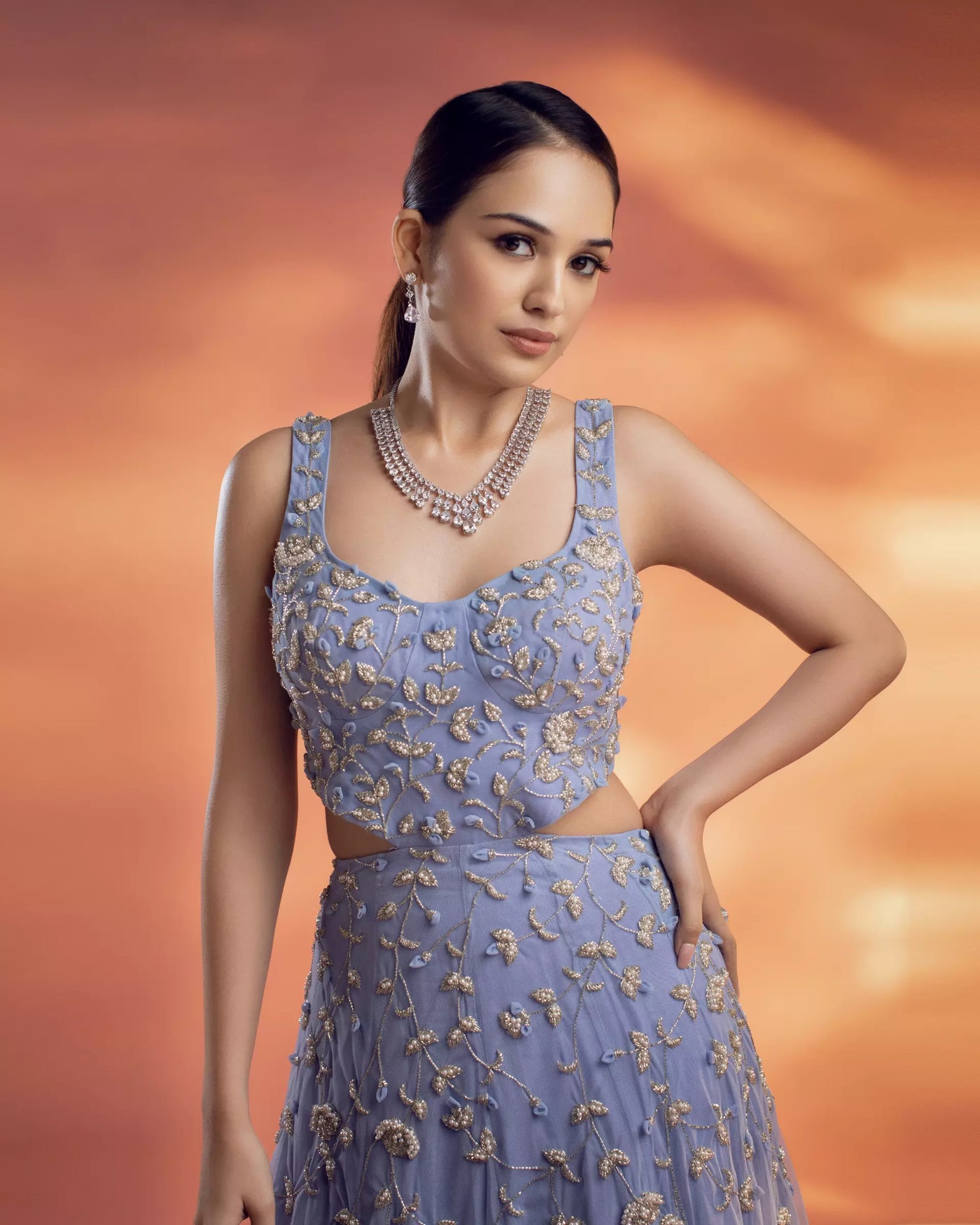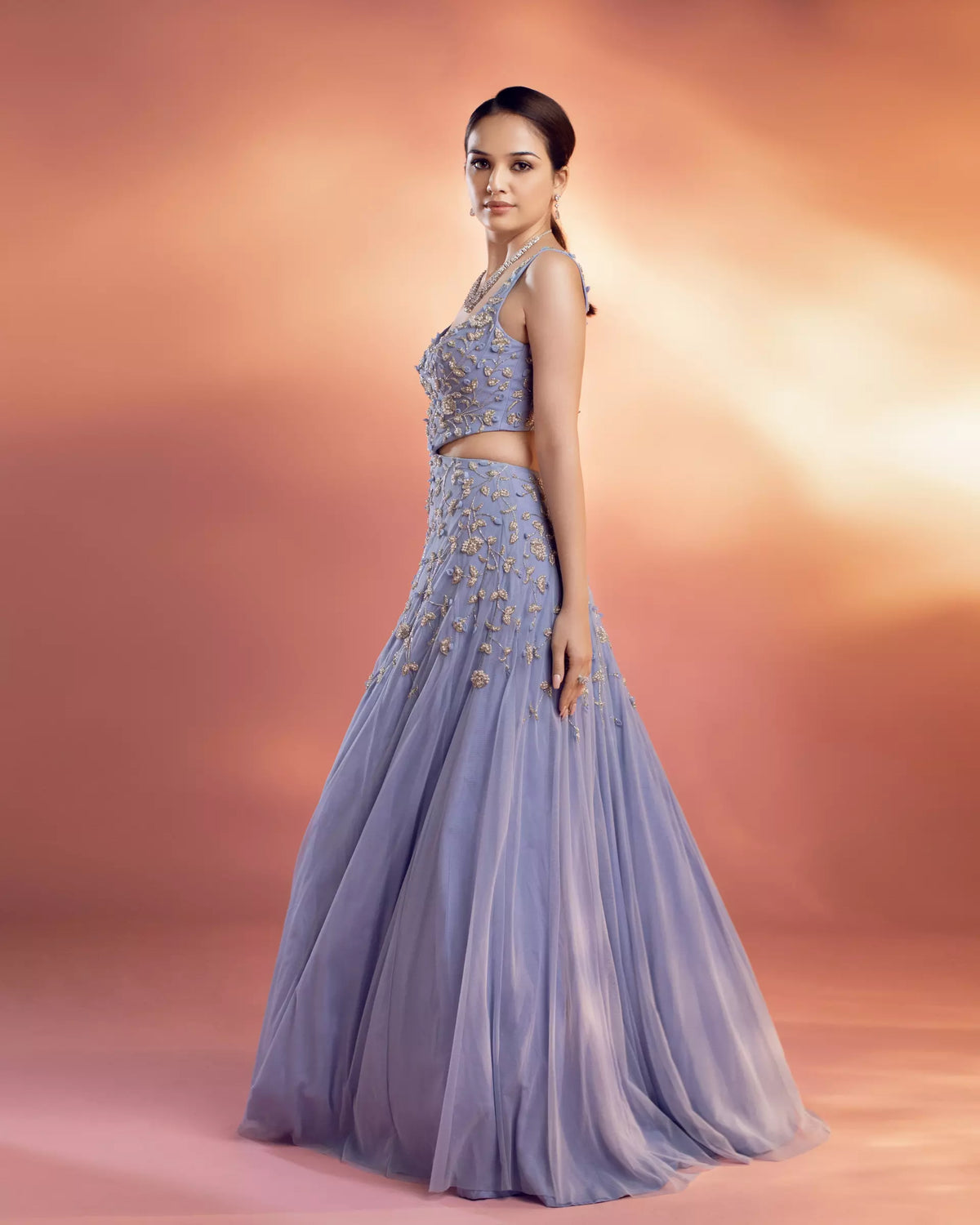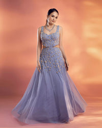 FEATURING AUBREY- Blue gown along with a waist cut, embellished with glass beads and pearls over a net base.
