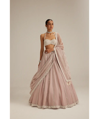 VVANI VATS- Ash Pink linear embroidered Organza Lehenga Set