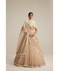 VVANI VATS- Light Beige Dense Pearl and mirror Lehenga Set with High Neck Blouse, Double Dupatta and Veil - XS