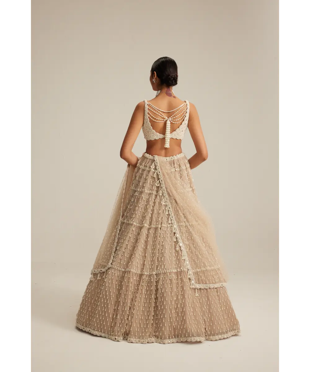 VVANI VATS- Light Beige Pearl Drop Multi Tier Lehenga Set.
