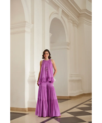 Bubblegum pink halter neck gathers top with floral embroidery, it is paired with a 2 layered georgette sharara.