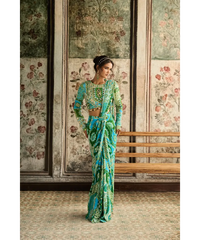 AQUA PRINT AND HIGHLIGHTED BLOUSE  PAIRED WITH PRINTED DHOTI SAREE