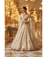 This lehenga set features delicate embroidery in ivory and gold sequin in a geometric pattern,. The full sleeves blouse has a plunging neckline and shows pearl and crystal tassels at the waist and wrist. It is paired with a matching four sided embroidered dupatta.