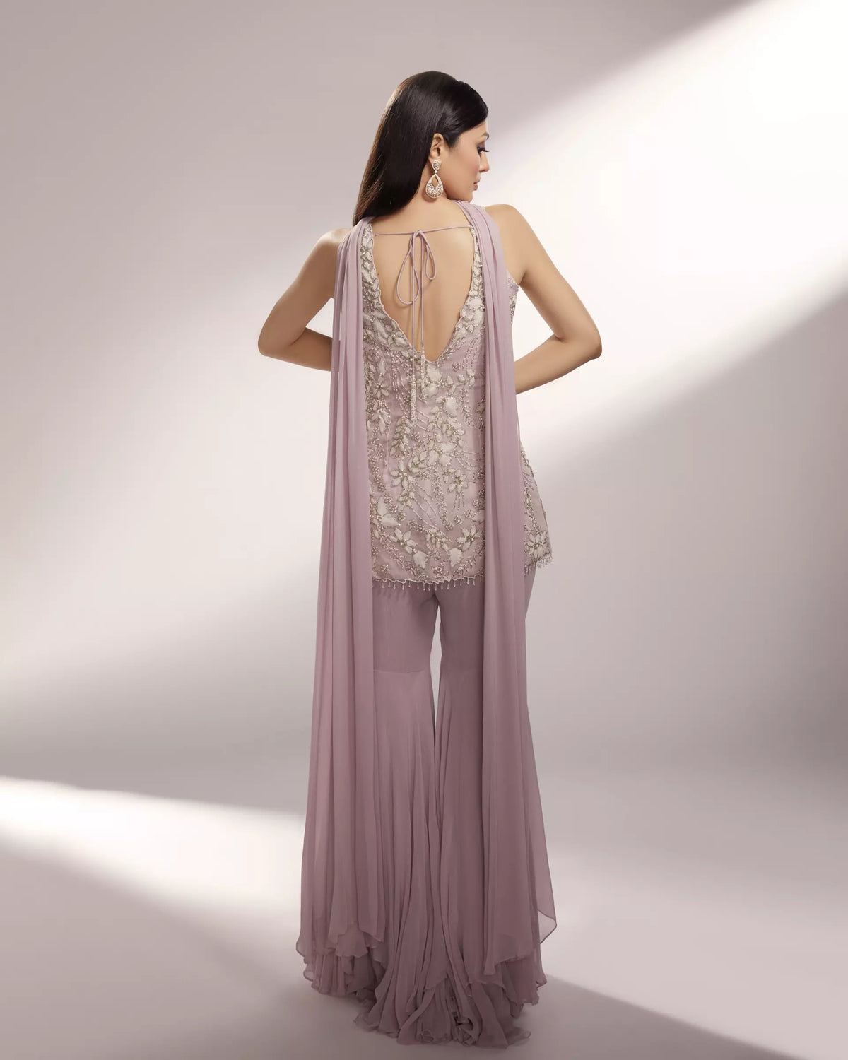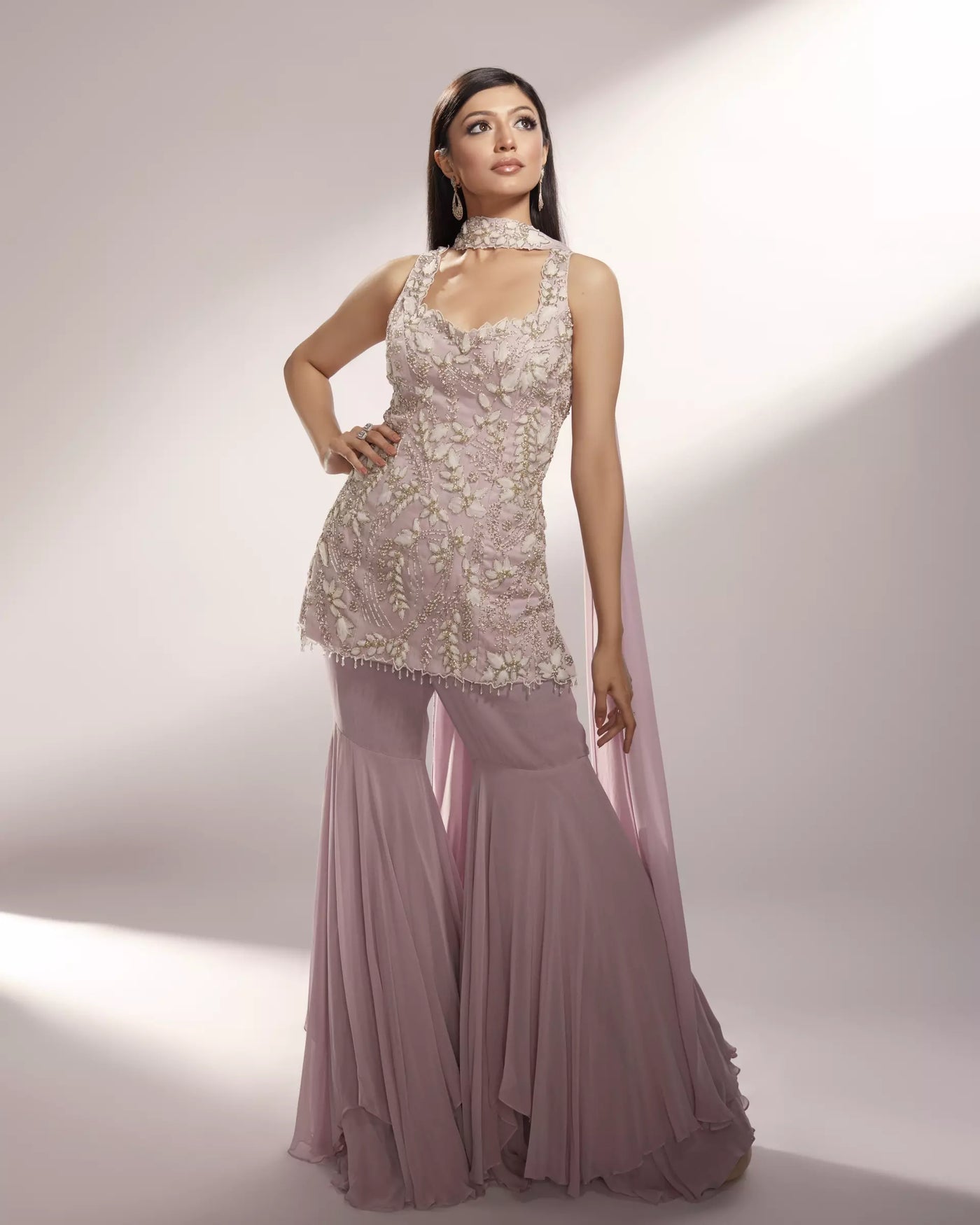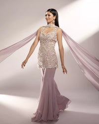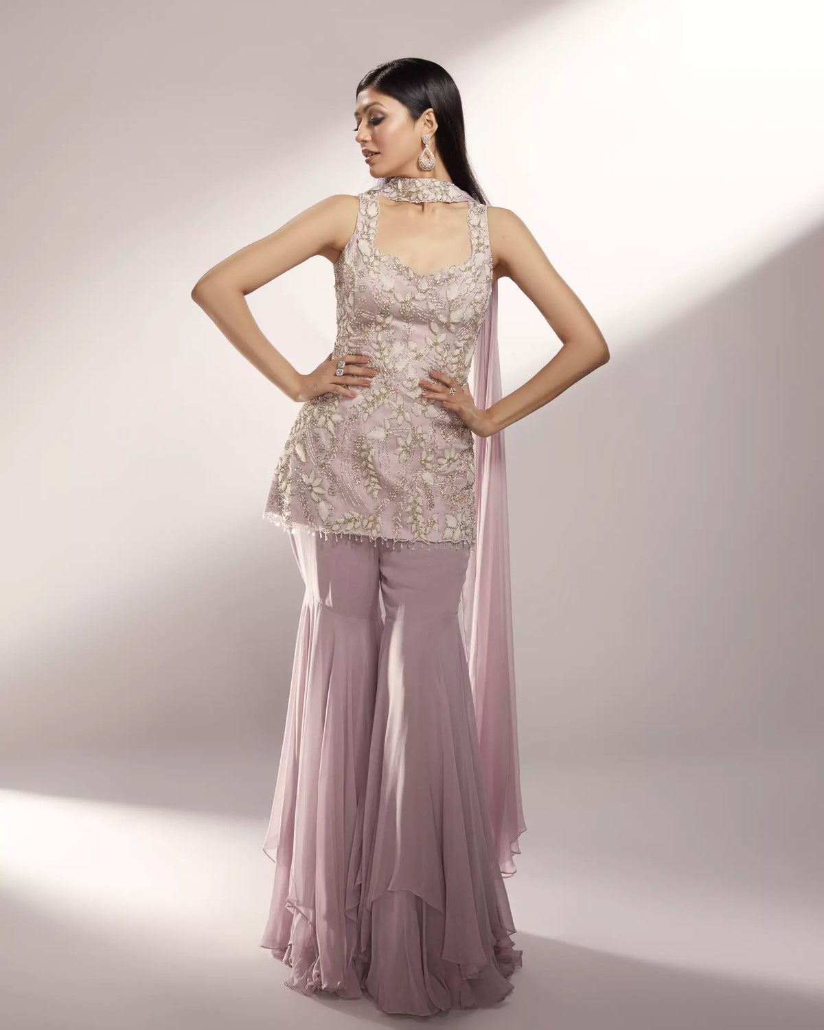 FEATURING NOVA Nova is our dusty lavender and white sharara set embellished with organza floral details accompanied with silver glass beads and pearls.