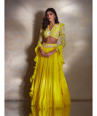 Yellow power shoulder crop featuring hand embellished ivory camellia flowers paired with a tiered georgette lehenga and embellished waistband with ivory drops & a ruffle dupatta