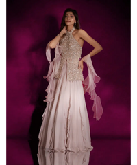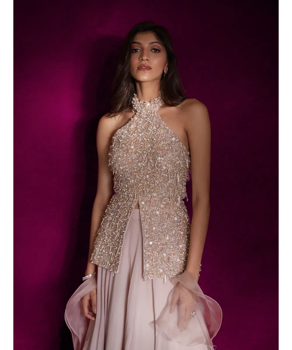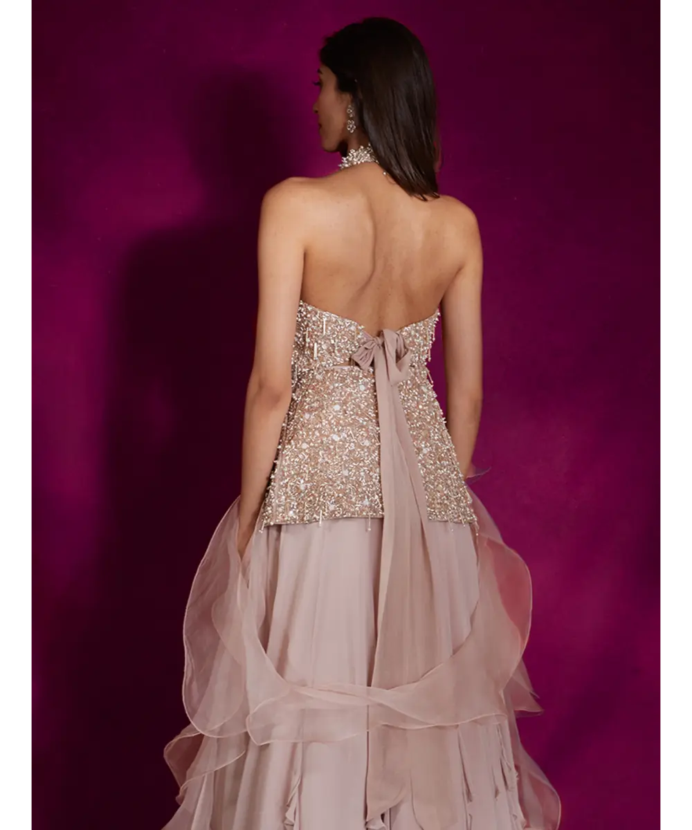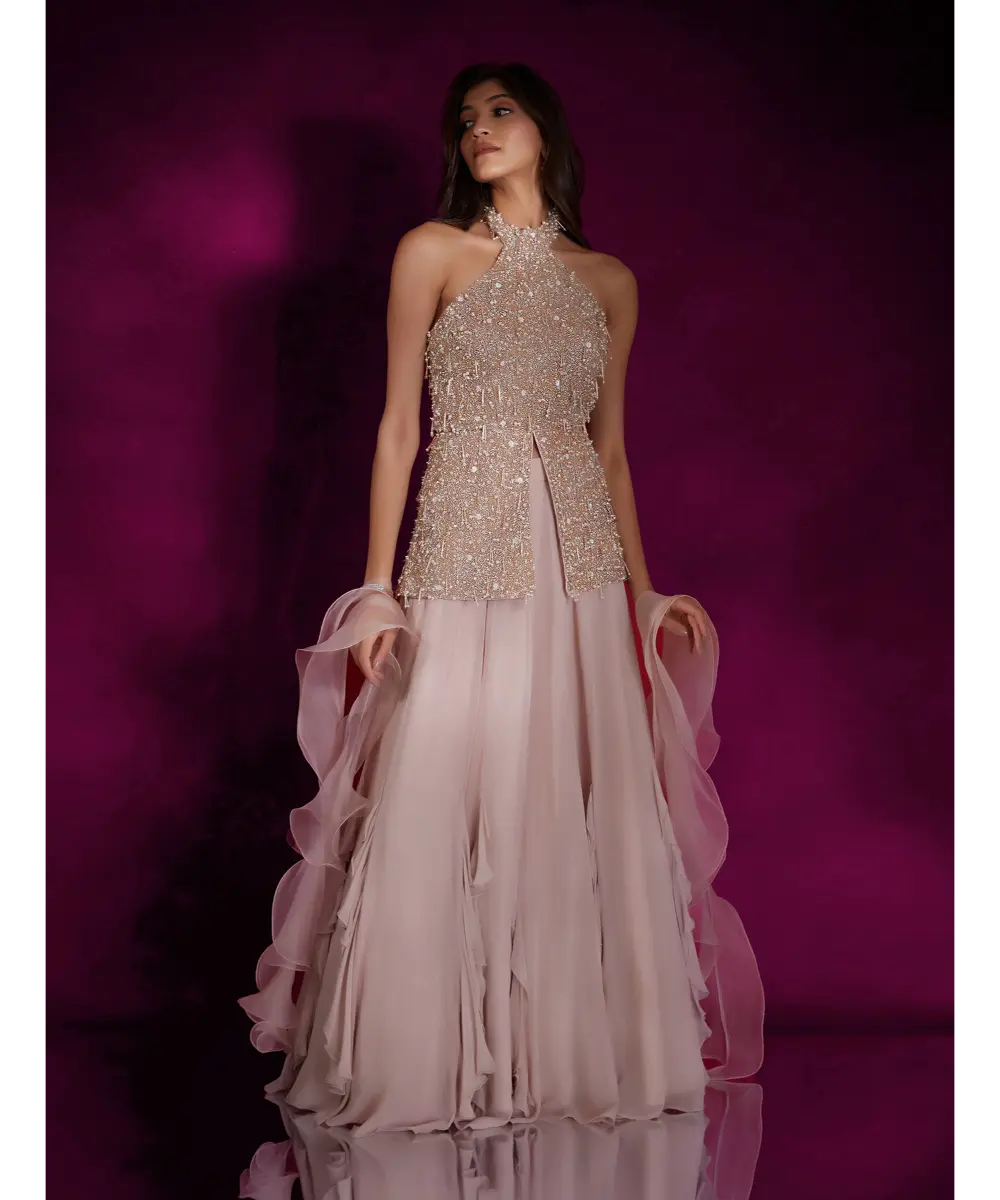 Dusty pink high neck peplum top heavily hand embellished with ivory pearls & silver glass beads and tassels, paired with a georgette lehenga with ruffles & an organza ruffle dupatta