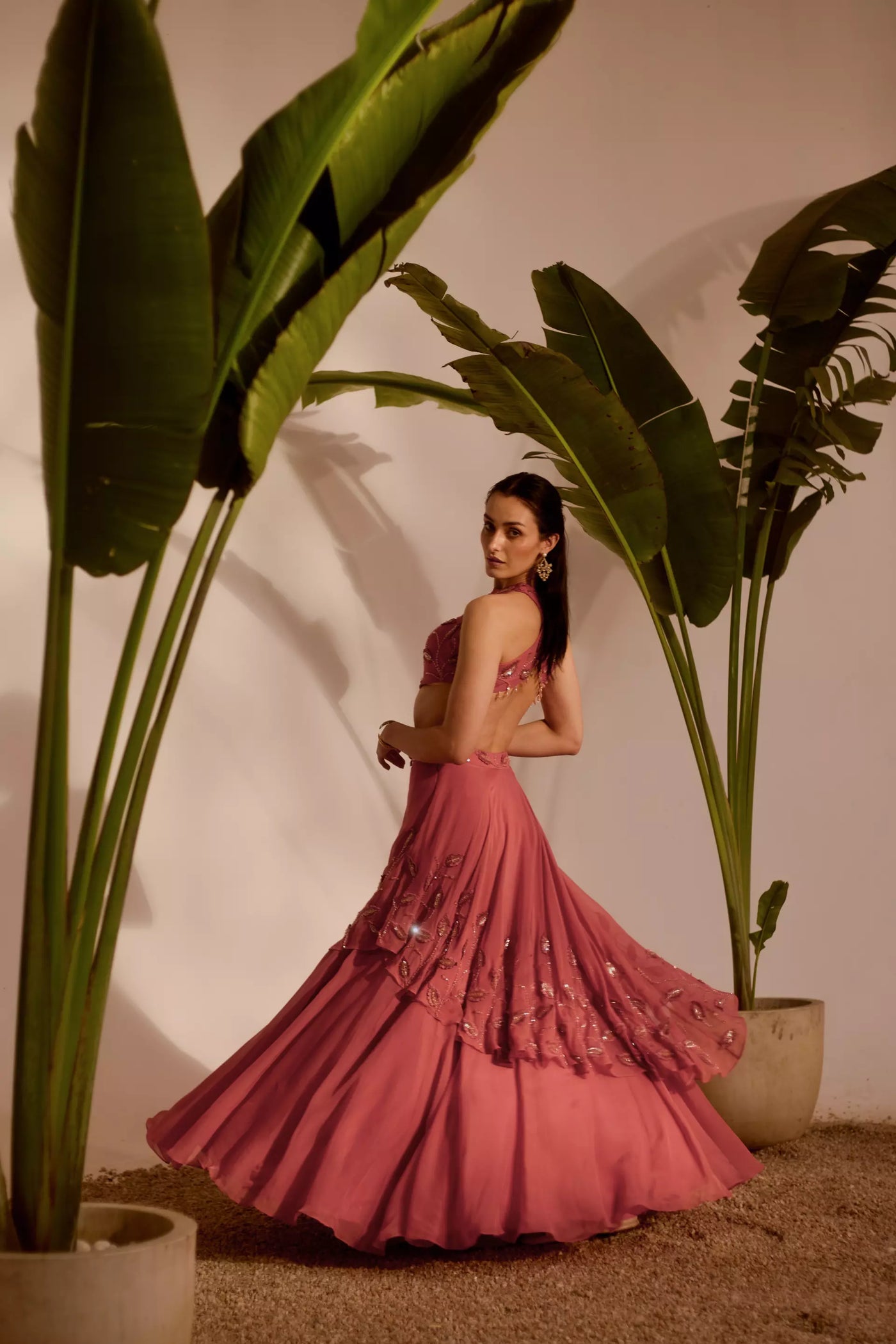 NIA DRAPE LEHENGA SET - APPLIQUE LEAF BLOUSE WITH DRAPE LEHENGA AND DUPATTA