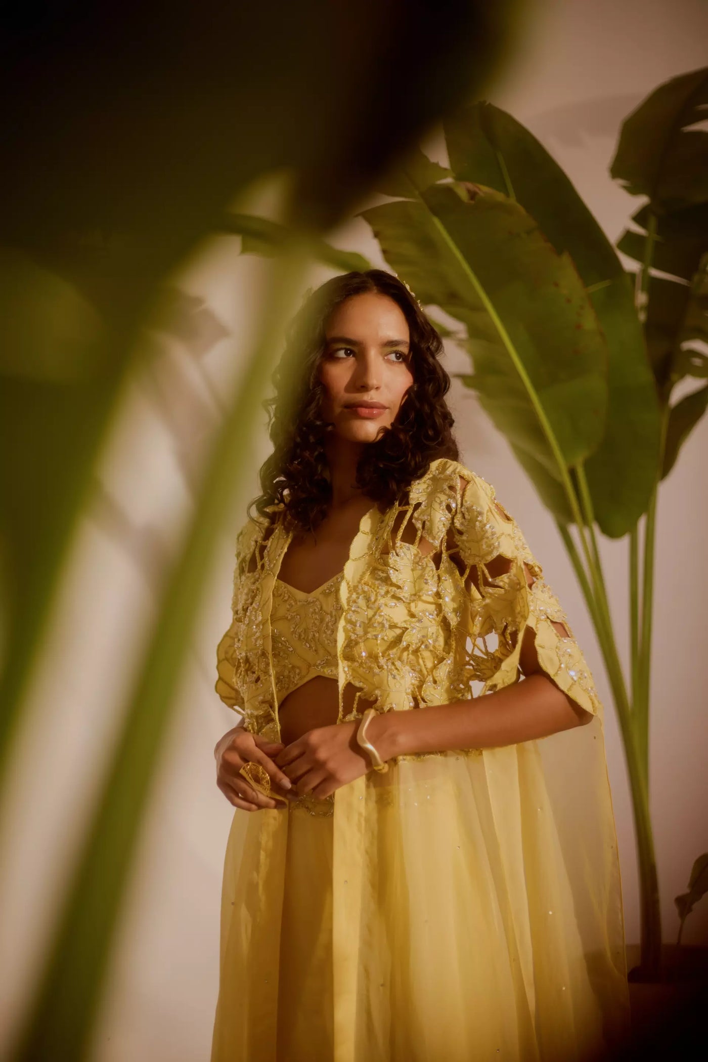 SOLANA CAPE SET - CUTWORK EMBROIDERED CAPE WITH GARARA AND EMBROIDERED BUSTIER