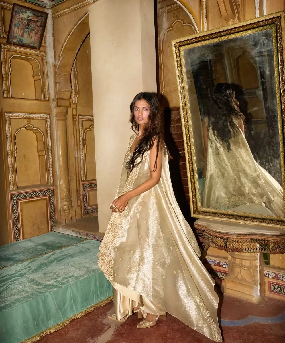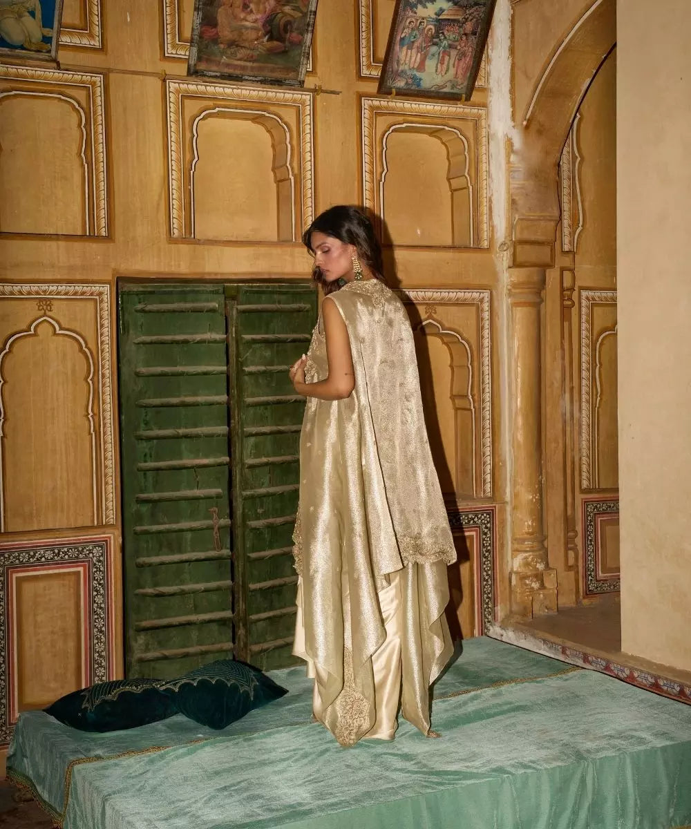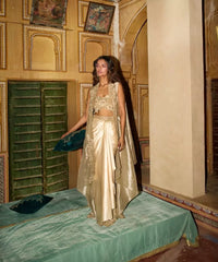 ADITI GUPTA - Champagne Gold drape Satin Skirt Set with pure Tissue Cape