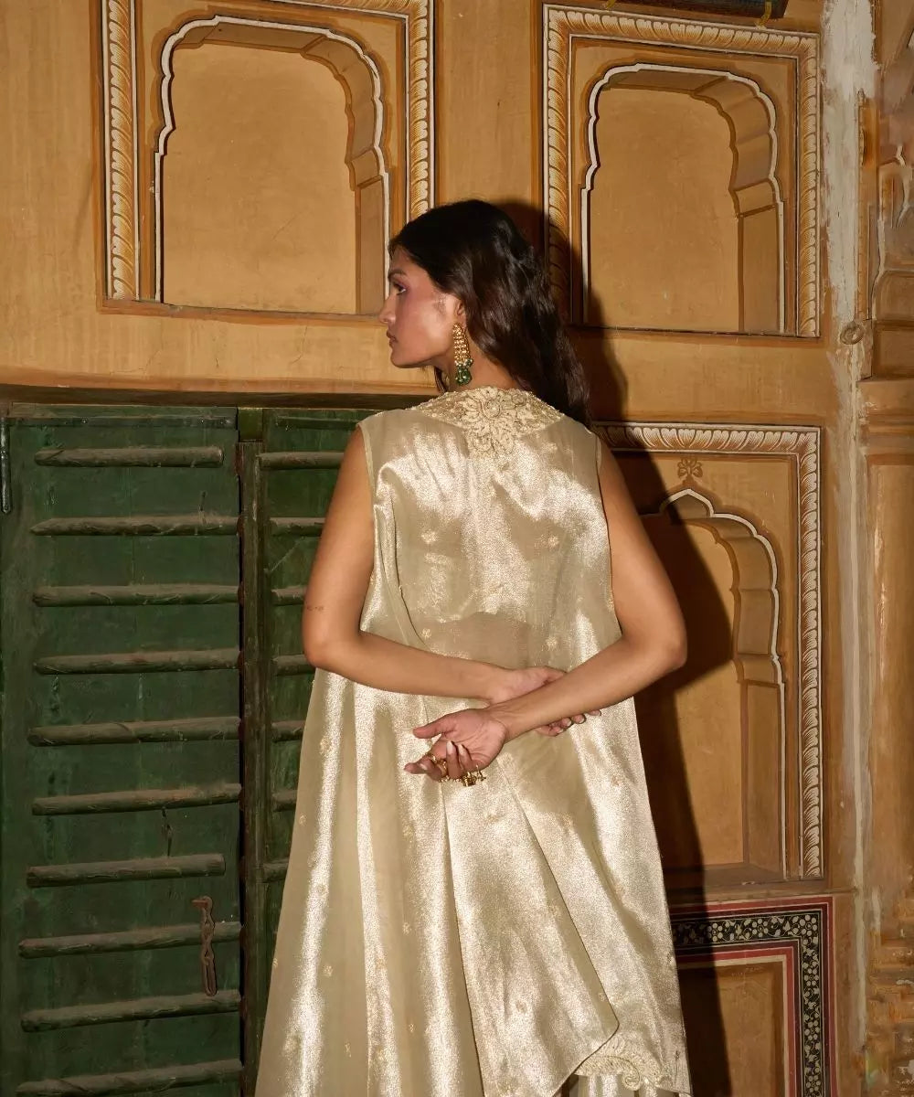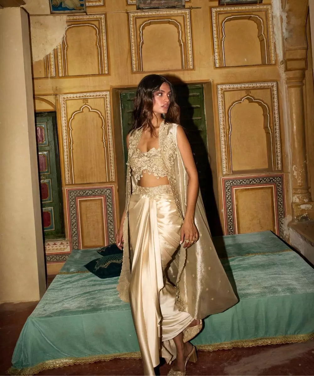 ADITI GUPTA - Champagne Gold drape Satin Skirt Set with pure Tissue Cape - XS