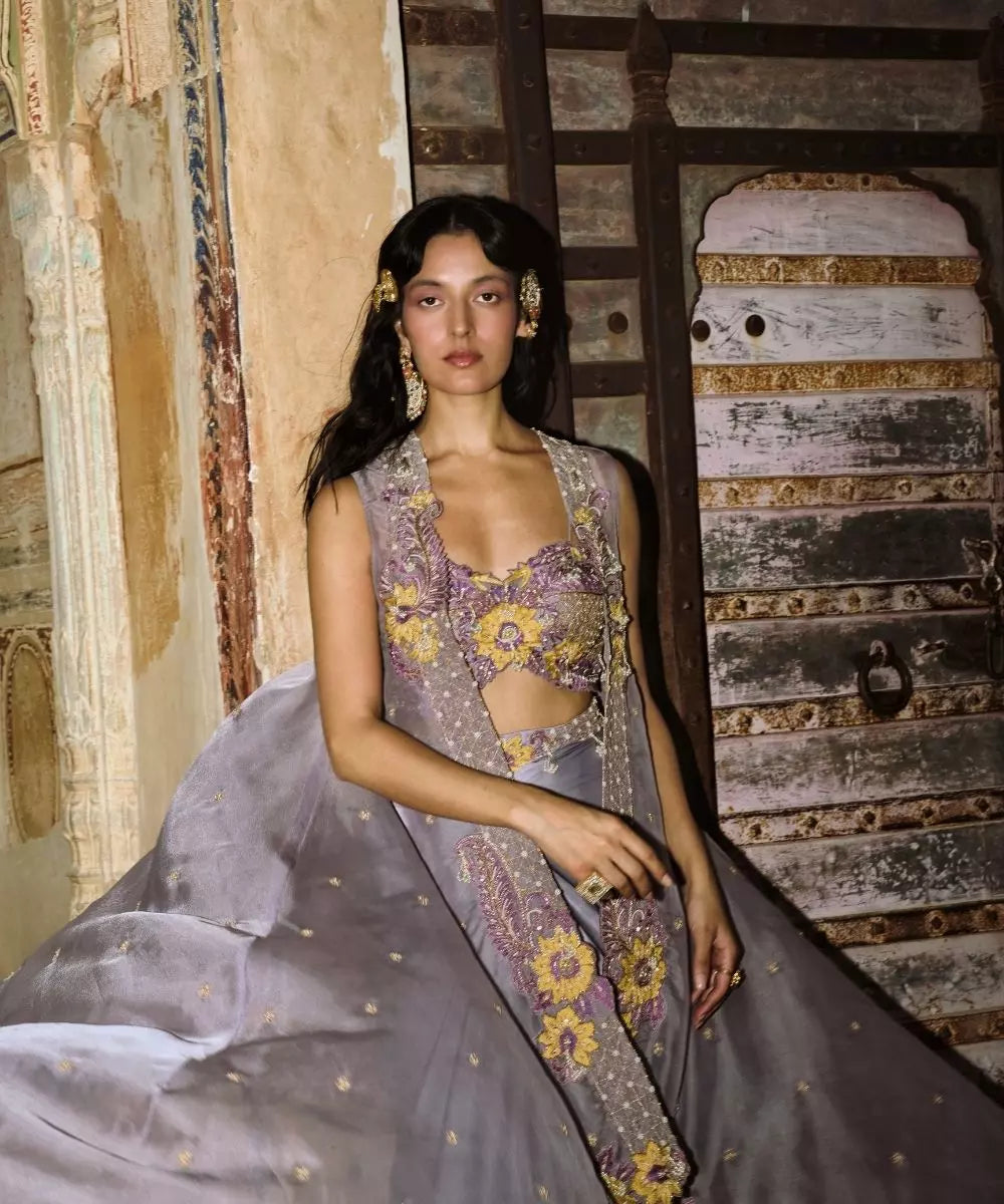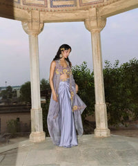 ADITI GUPTA - Lilac drape satin Skirt Set with organza cape
