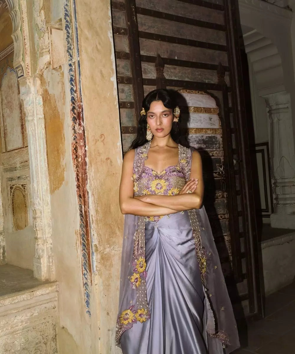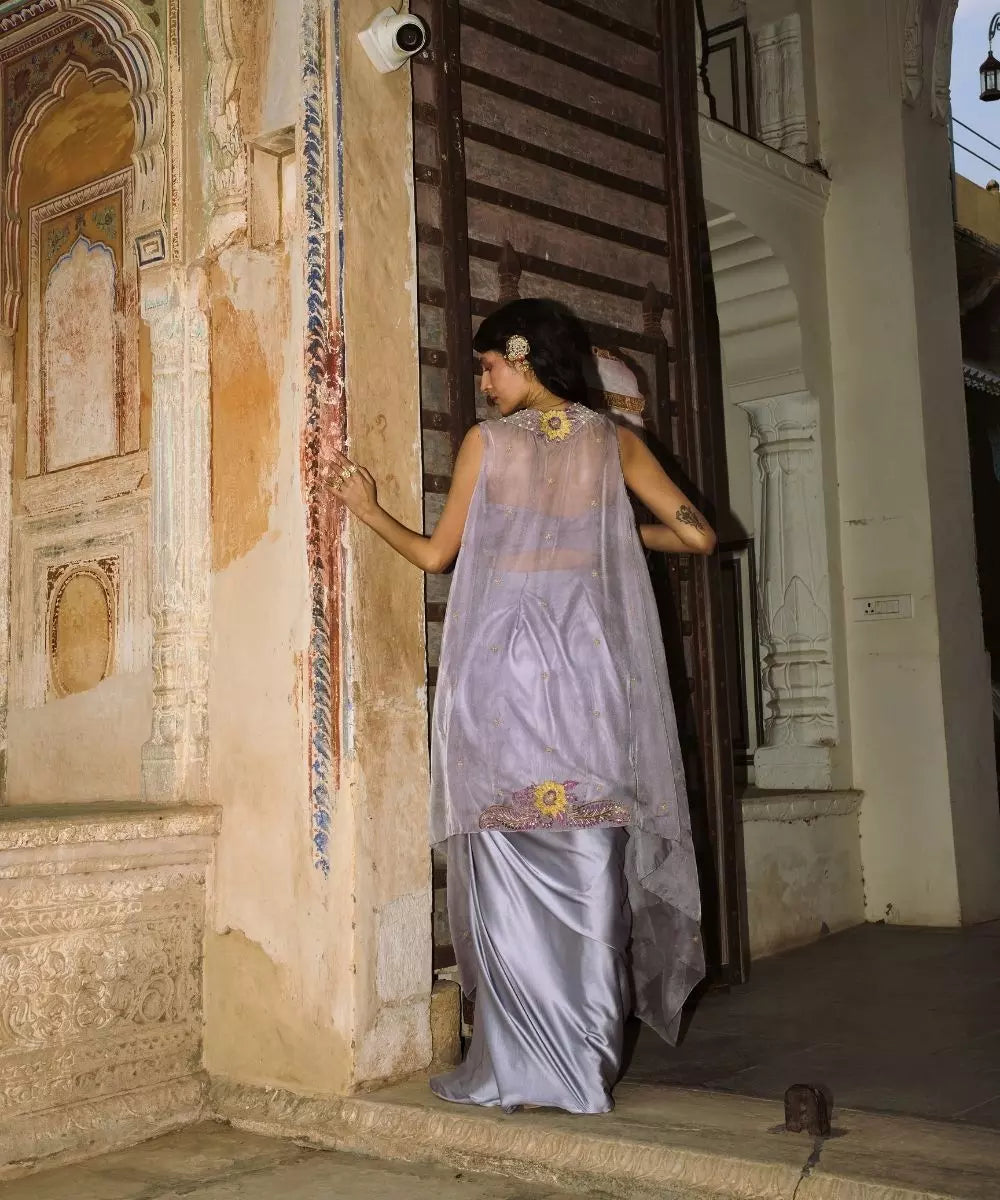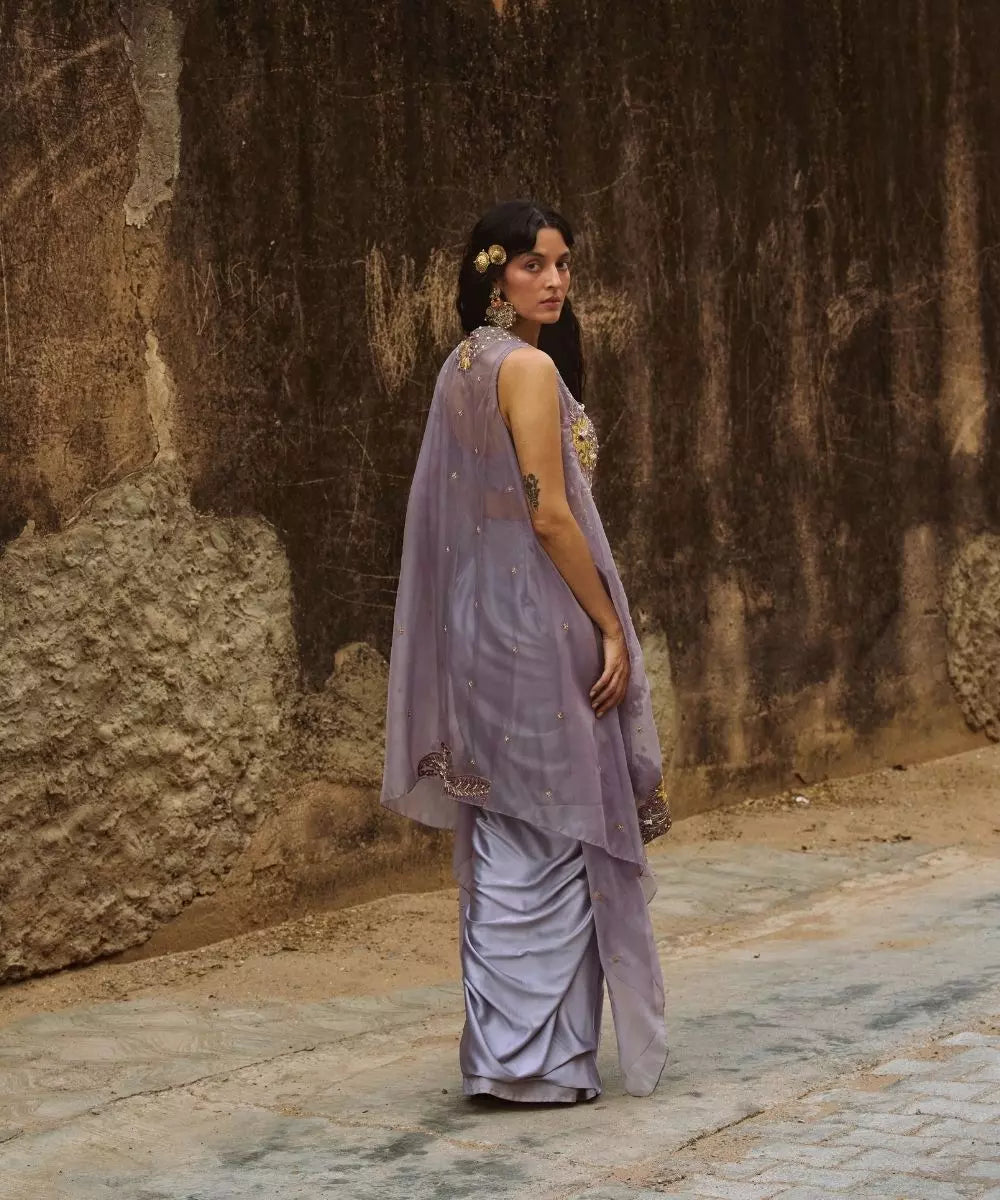 ADITI GUPTA - Lilac drape satin Skirt Set with organza cape - XS