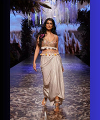 The glamming golden shimmer drape skirt is an apt outfit for your pool party, paired with a smart strappy crop blouse which is hand worked with resham, mirrors and zardozi. The fabric is breathable yet classy. Our Fiza collection - Youthful and fun is the vibe.
