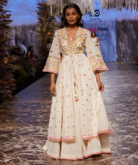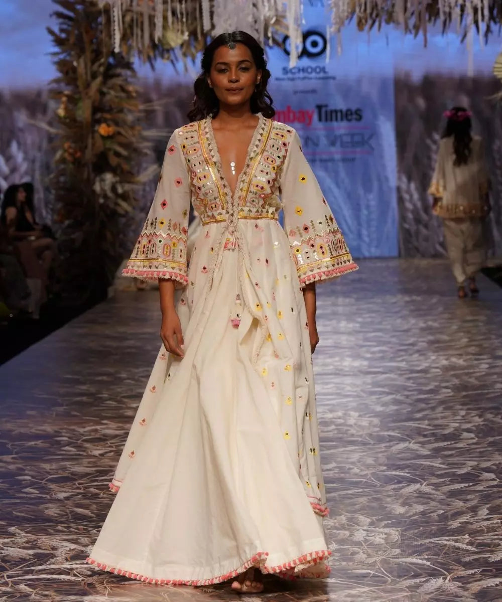 This gorgeous Heer ensemble has a contemporary, feminine vibe. The flared front open jacket is exquisitely embroidered with mirror and thread in phulkari tradition motifs. The flattering, Victorian skirt below it is perfect for a day event. Our FIZA collection - bold shimmer for the free spirited, adventurous woman in you!
