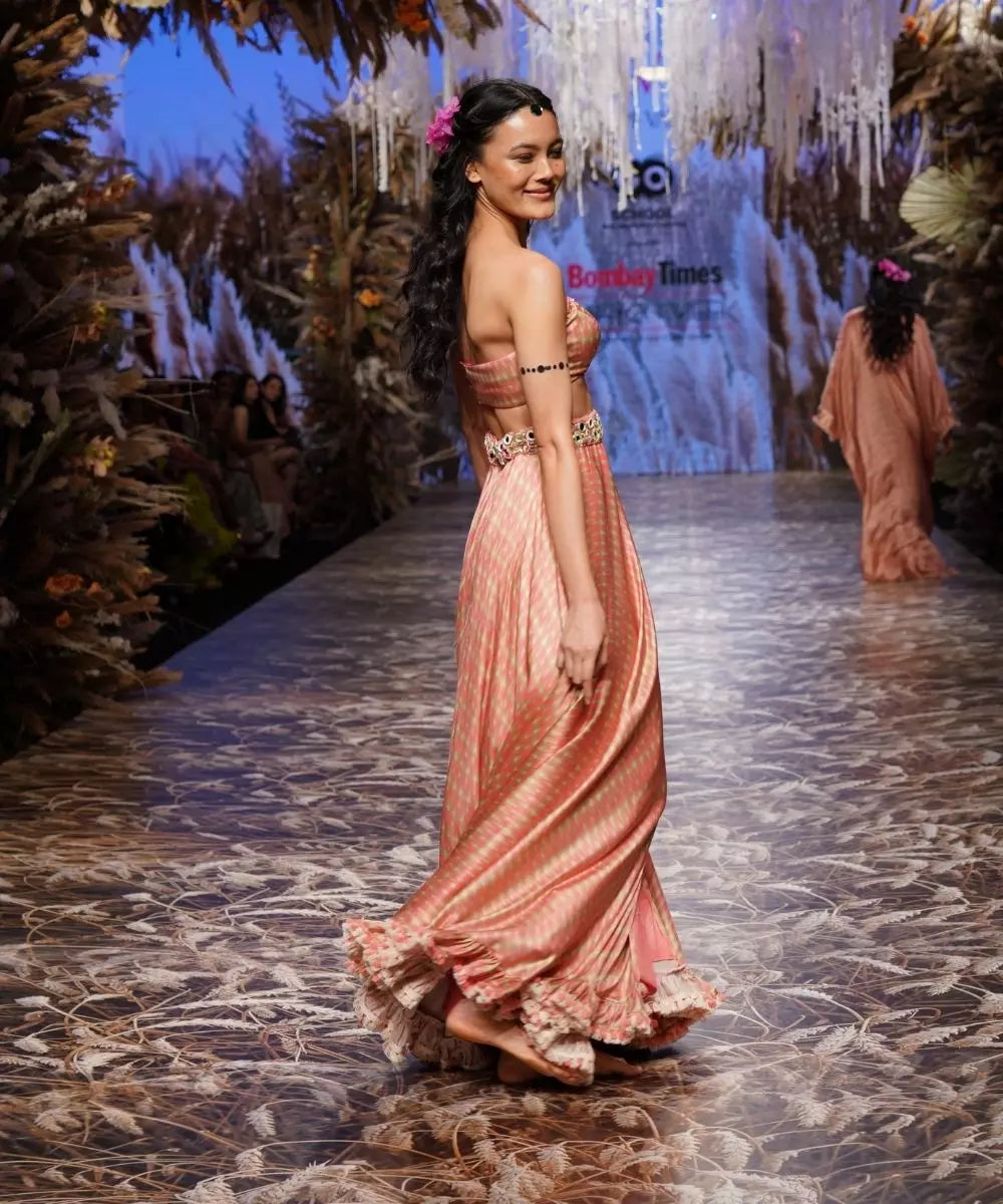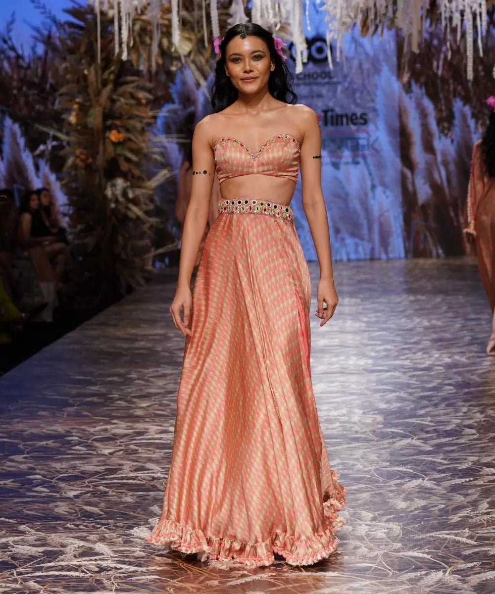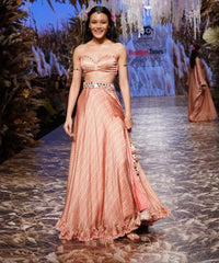 Wake the confident women in you by wearing our gorgeous Victorian skirt, crafted from satin printed fabric, featuring a high slit for a touch of allure, with a tube sweetheart blouse that adds a contemporary twist with minimal hand embroidery. This outfit is perfect for outdoor events, effortlessly blending elegance, sexiness, and a fashionable appeal.
