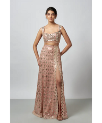 The crop top is hand embroidered with intricate mirror work and delicate embroidery, featuring a flattering square neckline and beads hanging along hem.The high-slit skirt is equally captivating, showcasing  mirror work and embroidery that shimmer beautifully.