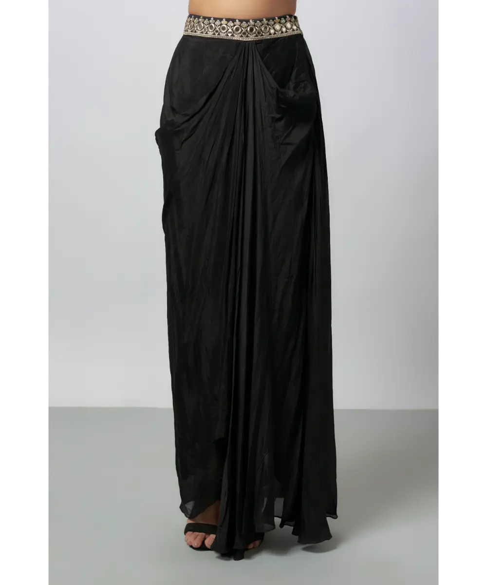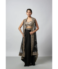 This contemporary fusion set features a heavily embellished, mirror-worked strapless blouse  paired with draped skirt. Completing the look is a sheer cape-style jacket adorned with intricate embroidery and mirror work. The long hemline of the cape enhances the dramatic effect.