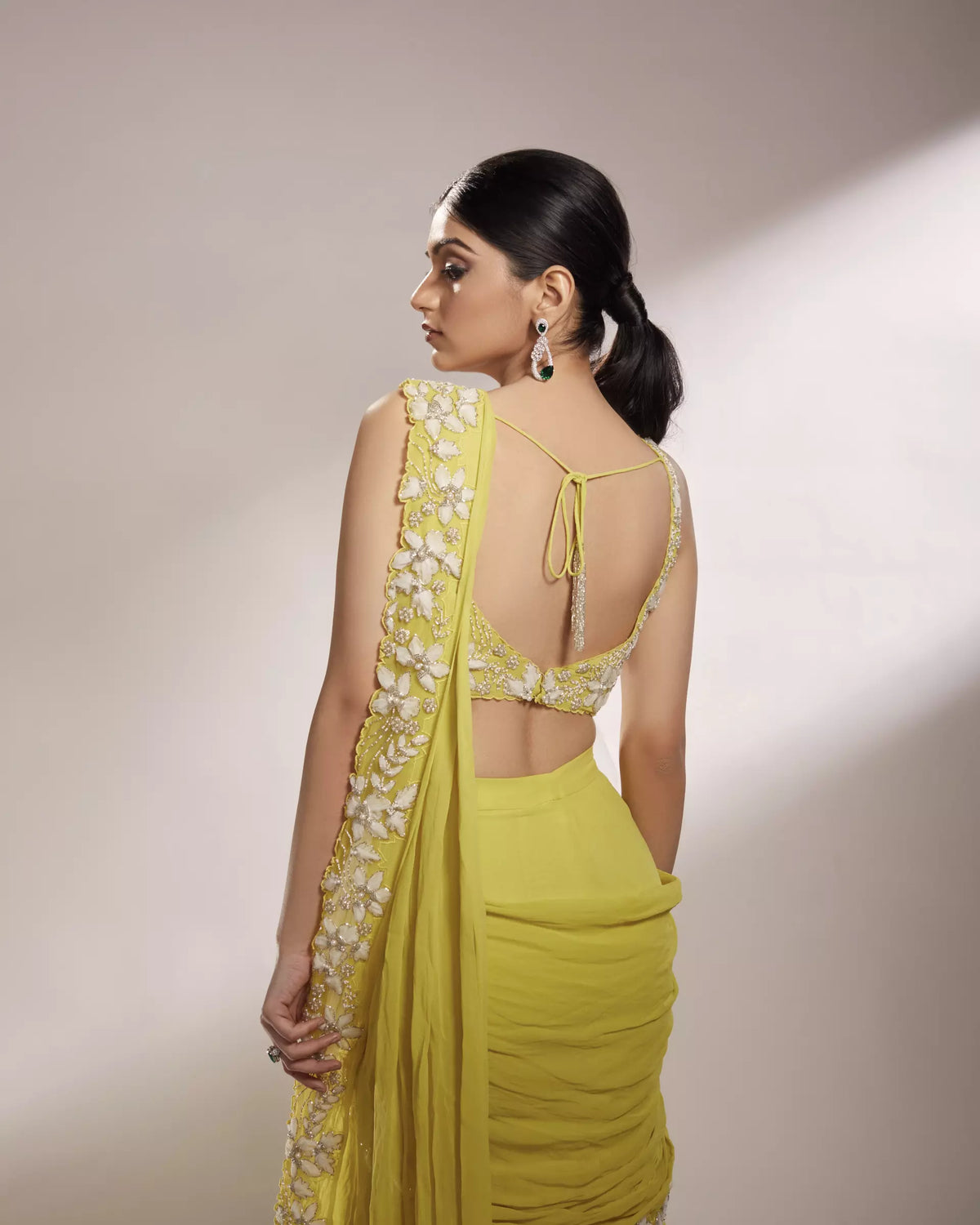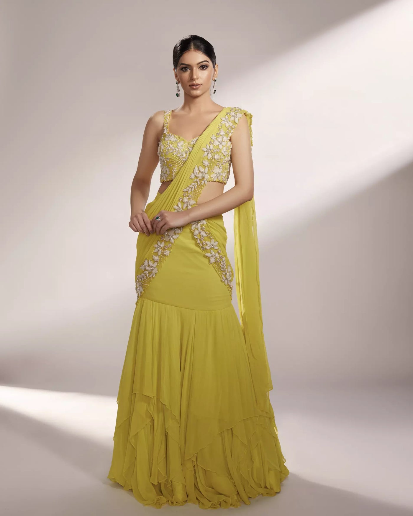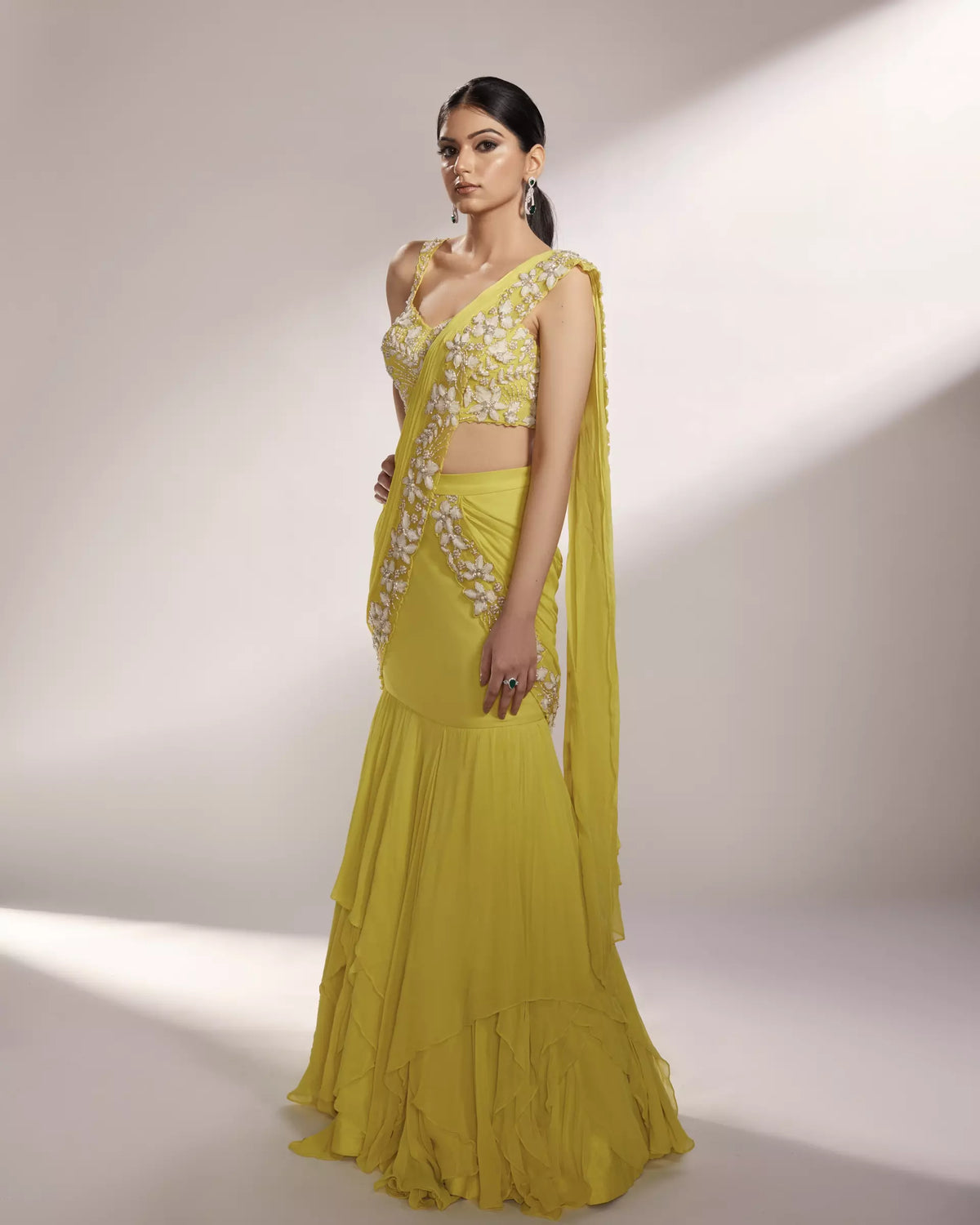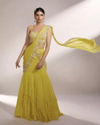 FEATURING LEAH - Lime yellow pre-draped saree lehenga embellished with organza floral details accompanied with silver glass beads and pearls along with a layered georgette skirt.