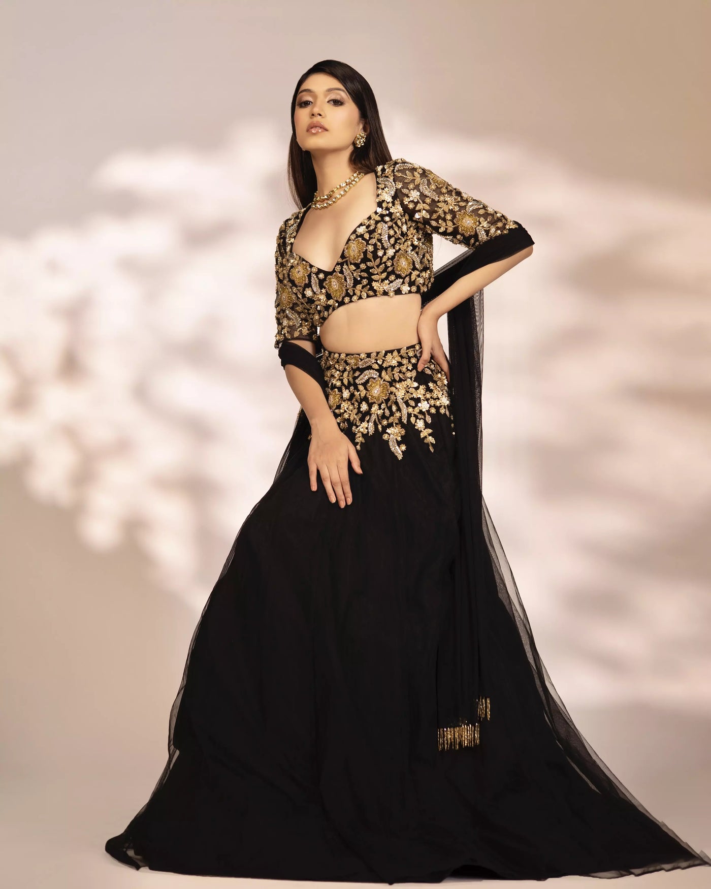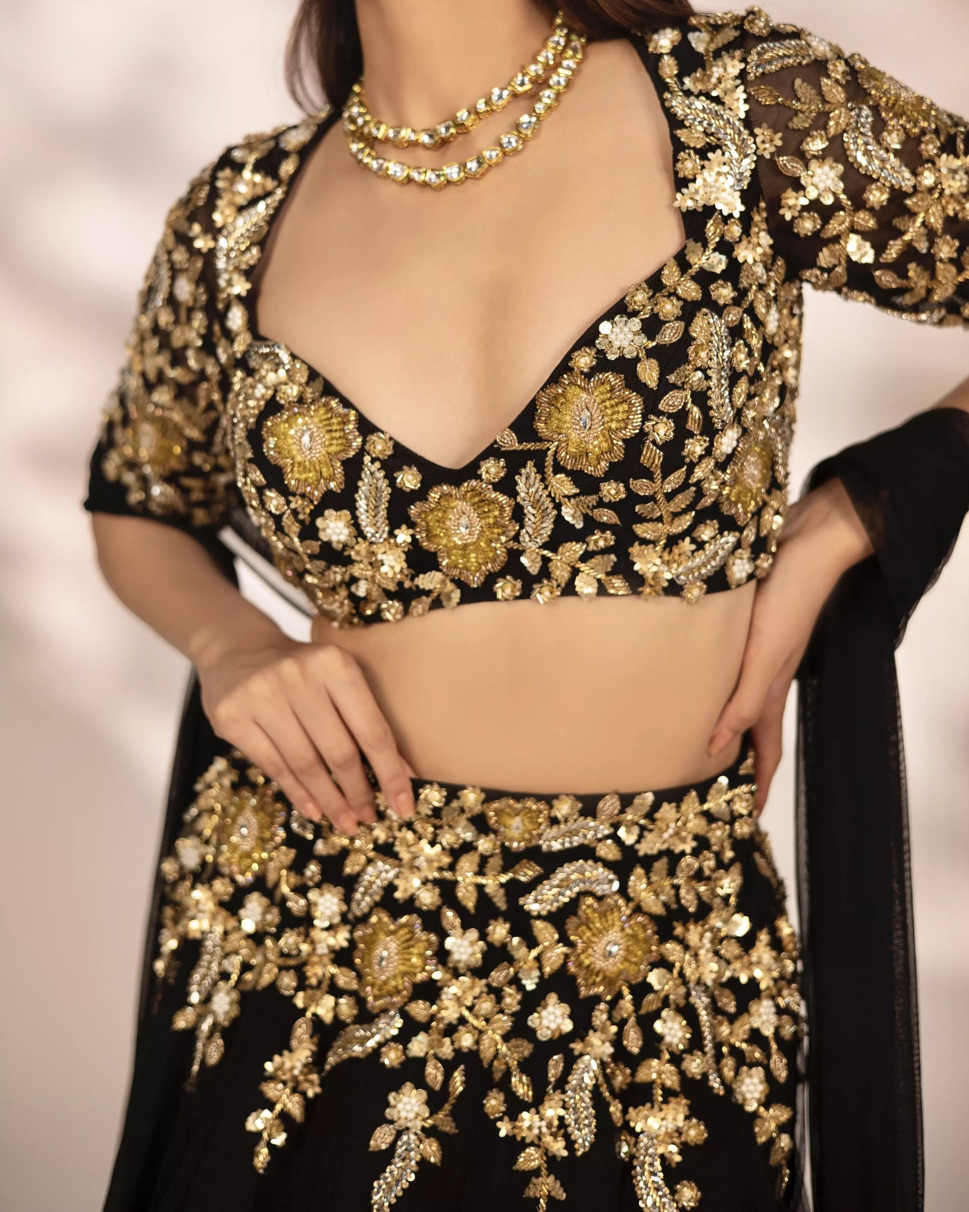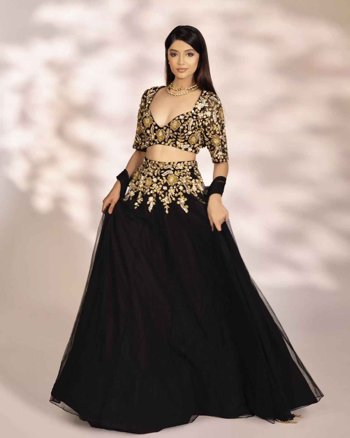 FEATURING NARA - Black lehenga with embellishments on blouse, skirt and dupatta hem.