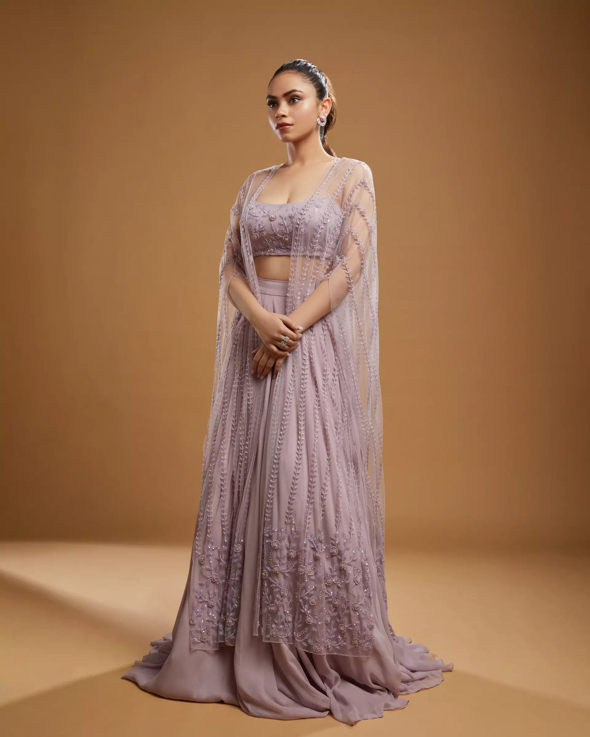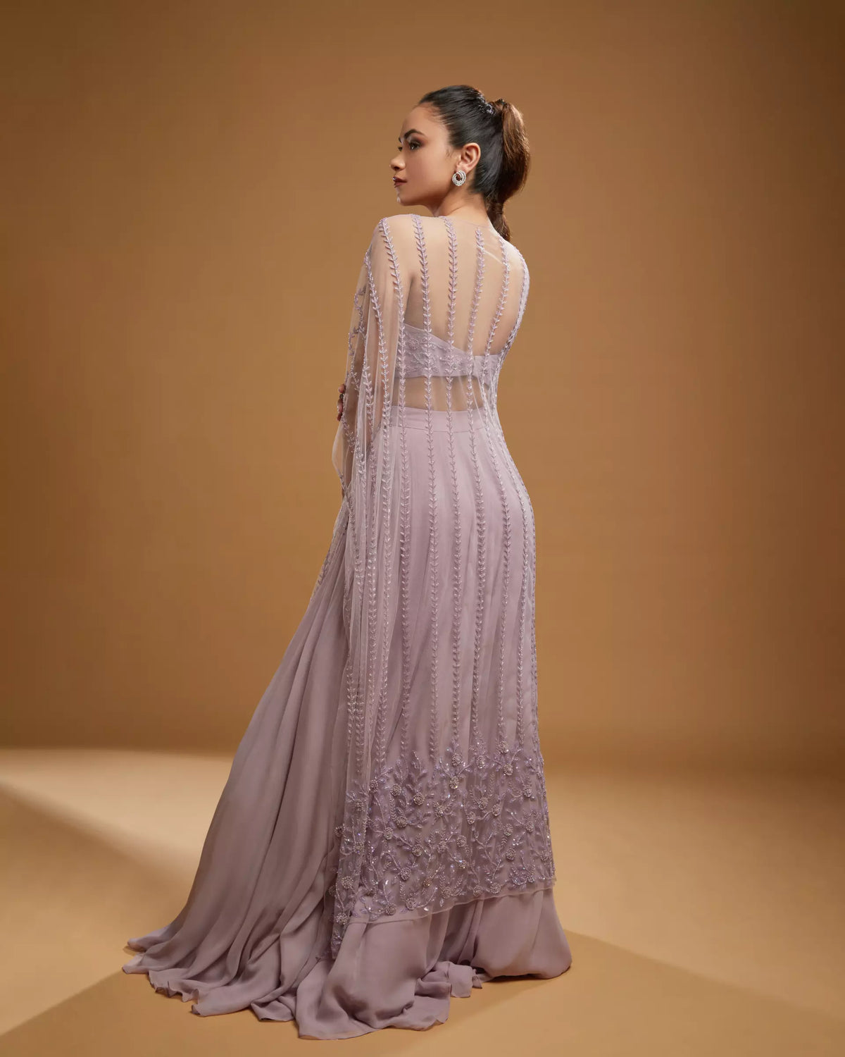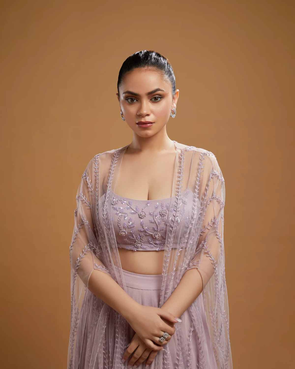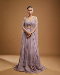 FEATURING TASMIN - Tasmin is a jacket lehenga set with an embroidered jacket and blouse paired with a fluid georgette skirt. embellished with glass beads and sequins over a net and georgette base.