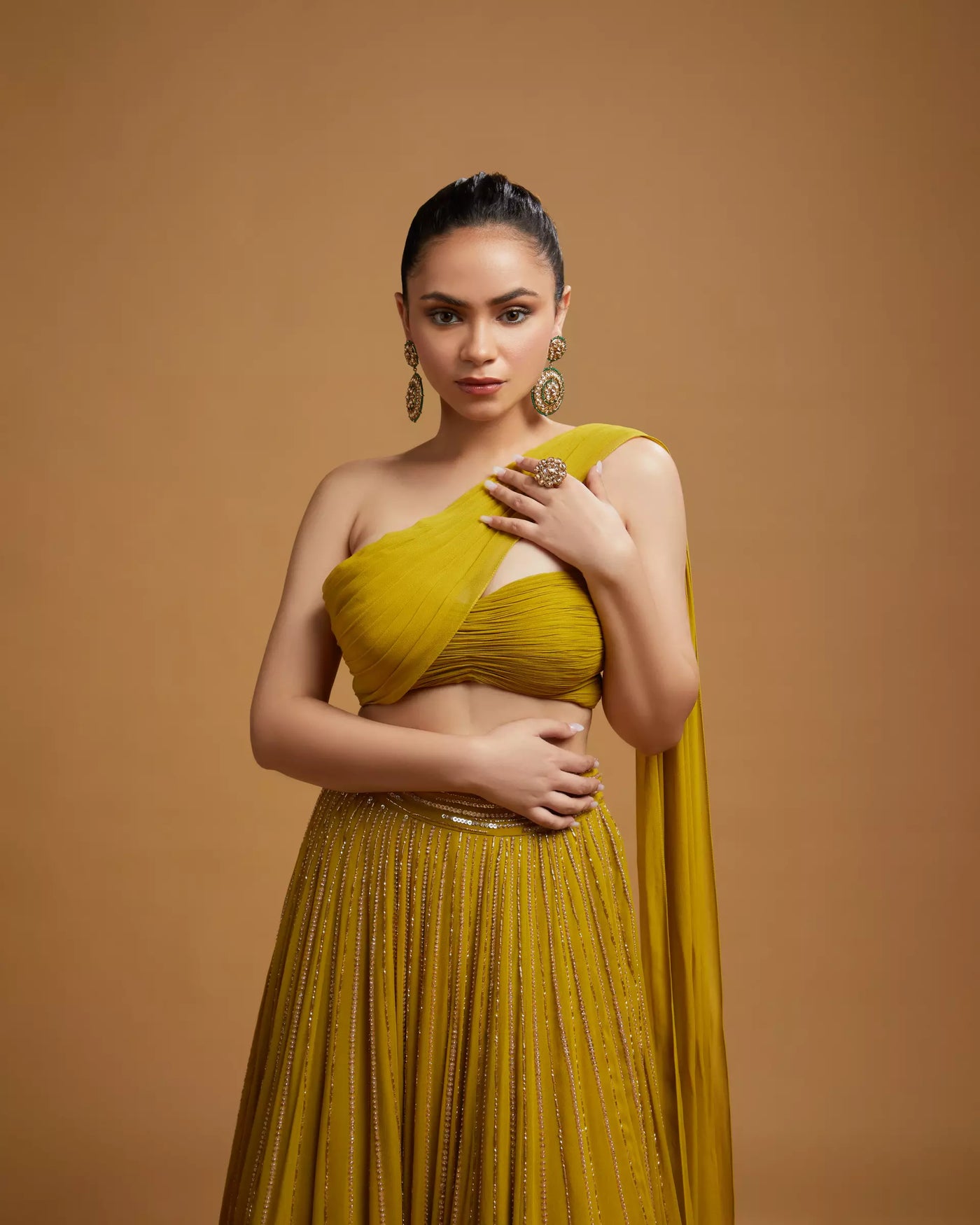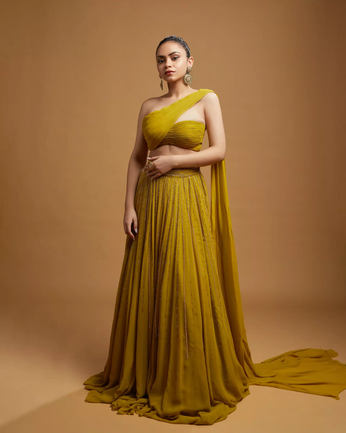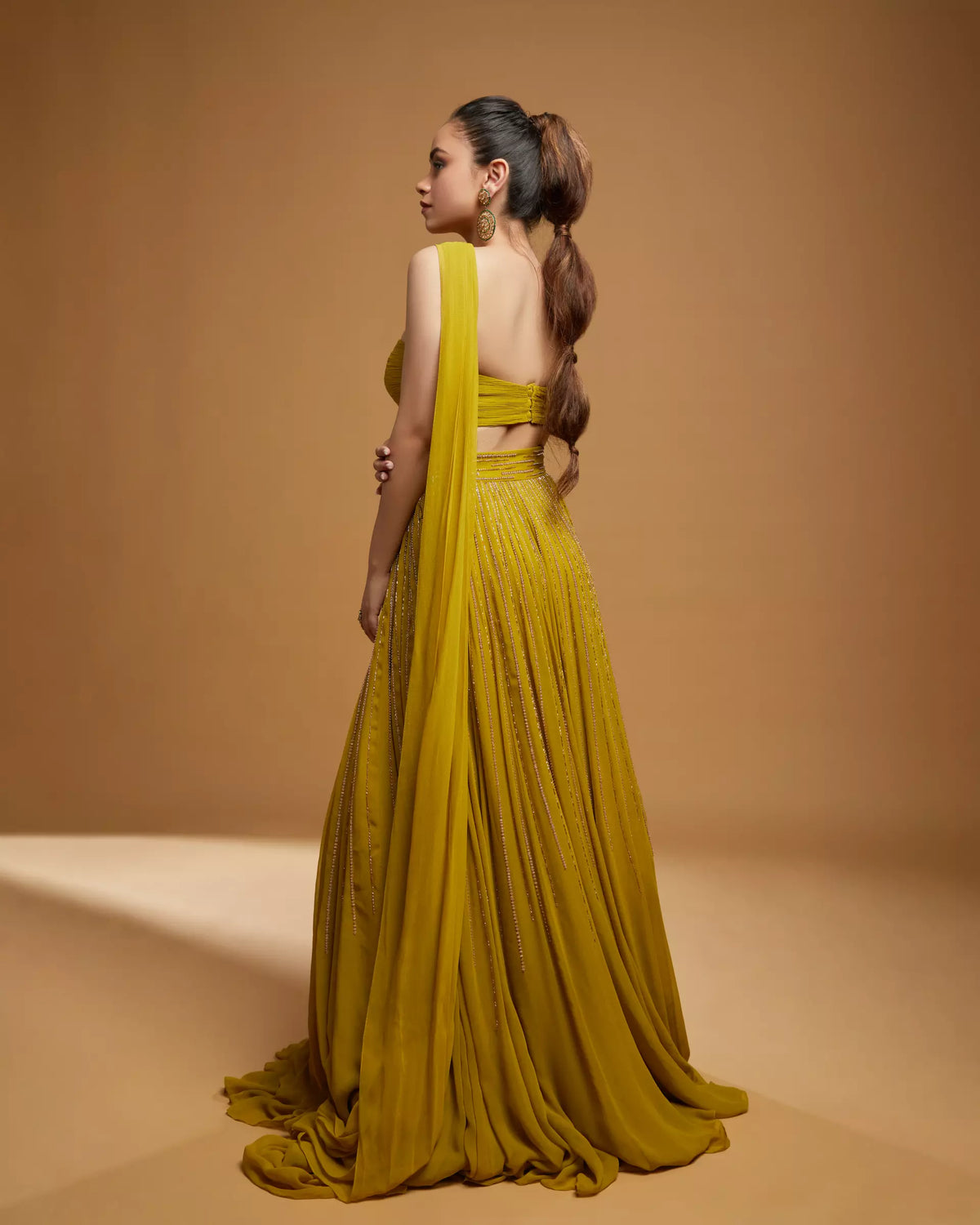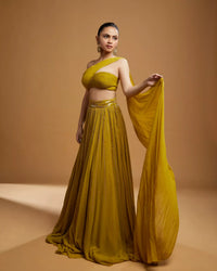 womenFEATURING TISH - Tish lehenga in Cress green is our lehenga with a ruched tube blouse and an long attached drape, with a skirt embellished witch champagne details and materials like sequins and glass beads.