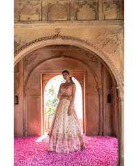 Pink embroidery bustier with offwhite and pink highlighted skirt with pink tissue dupatta