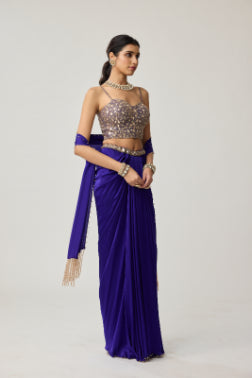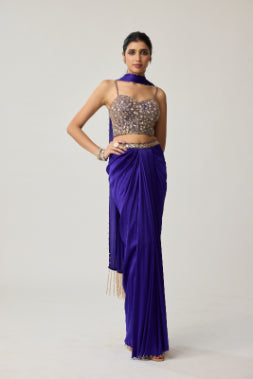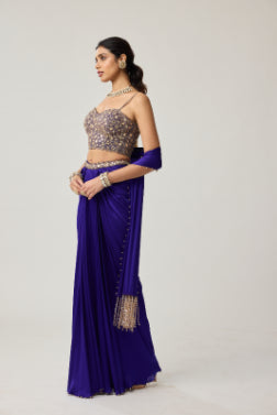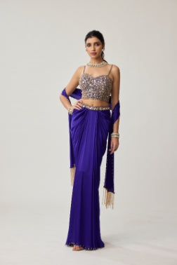 VVANI VATS - Persian Blue Mirror Corset Satin draped skirt Set