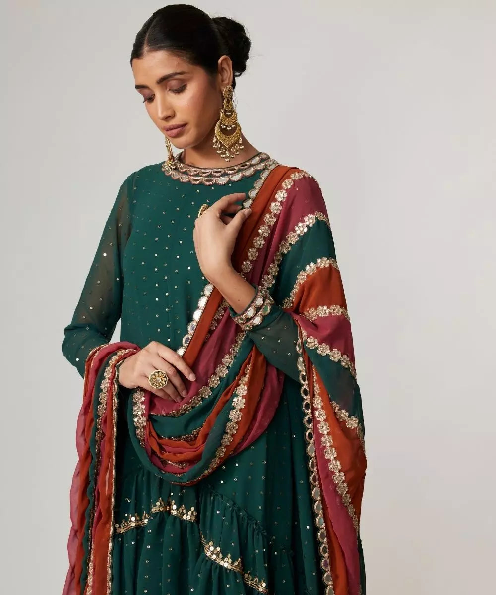 Jade green sequins embroidered kurta paired with a dhoti and multicolor mirror embroidered dupatta.