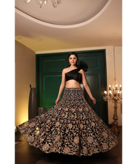 This black lehenga set features all over contrasting floral motifs embellished with sequin, beads, crystal embroidery. Paired with a raw silk one shoulder blouse with ruffle detail and  and attached drape with a dramatic 3D flower element.