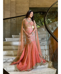 Our coral fishcut lehenga is hand embroidered with sequin, crystal, cutdana and pearl work, with a flowing trail at the back and cutwork dupatta. The outfit is crafted in net and colours can be customized.