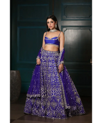 This electric blue lehenga features all over sequin, crystal and cutdana embroidery with a mix of floral and geometric motifs. Paired with a strappy blouse in raw silk and embellished sequin and crystal embroidery. The outfit is paired with an embroidered dupatta in net. Blouse can be customized