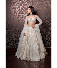 This regal ivory lehenga features all over sequin, cutdana, crystal and pearl embroidery paired with a full sleeves square neck blouse. The embroidered dupatta is crafted in net