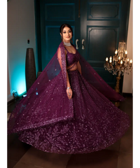 This jewelled purple lehenga features all over tonal sequin, crystal and cutdana embroidery. Paired with a strappy blouse with tassel string detailing and an embroidered dupatta in net