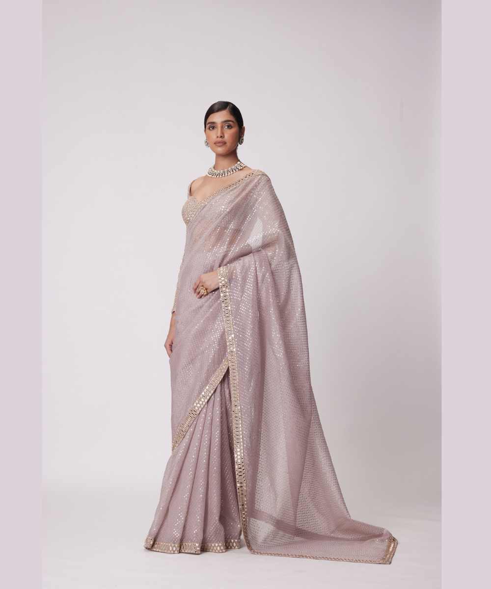 Ash Pink Organza Saree Clubbed with Real Hand Cut Mirror Embroidered Full Sleeve Blouse.