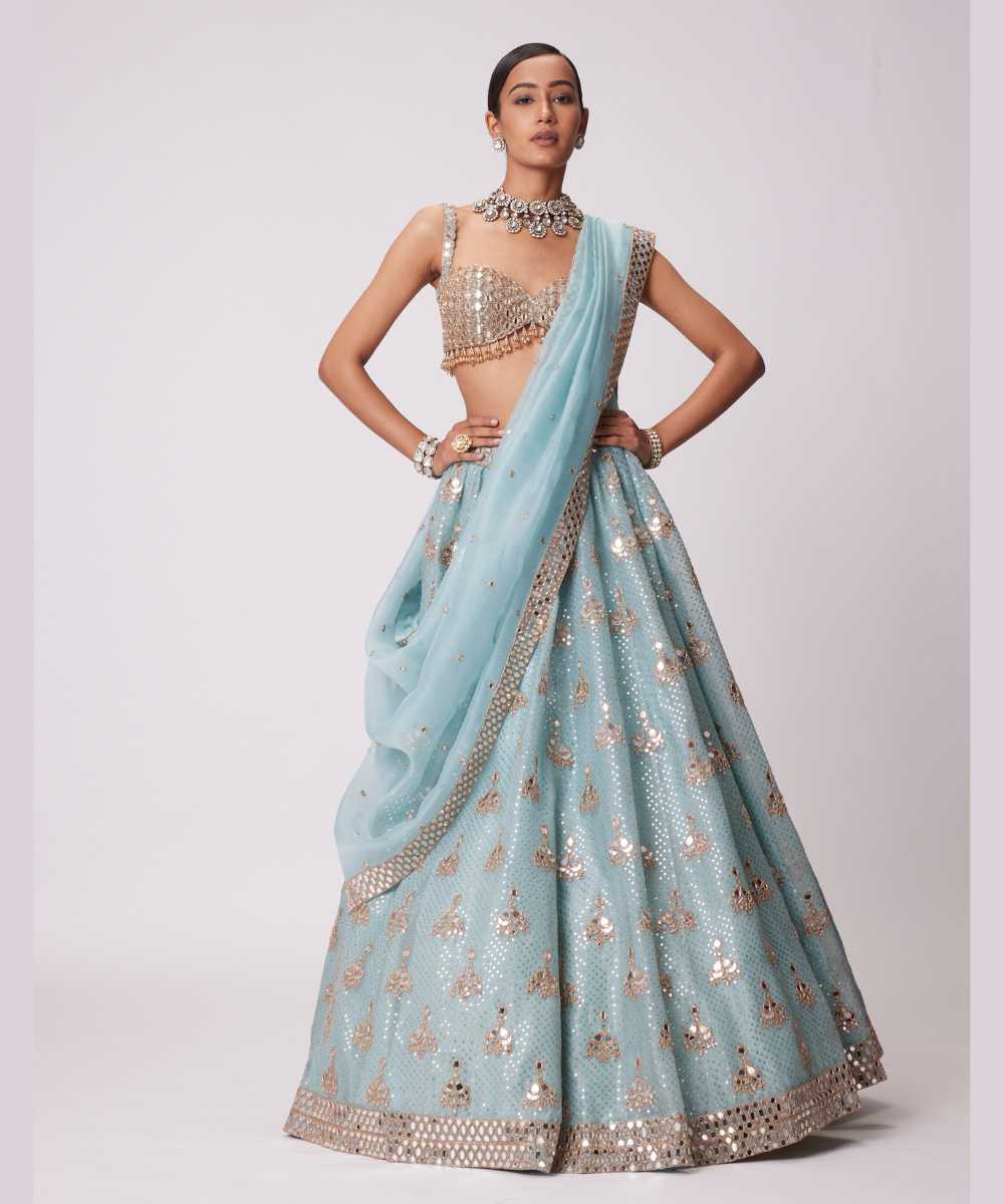 Powder Blue Organza Sequin Embroidered Lehenga And Dupatta Clubbed With a Heavily Mirror embellished sleeveless blouse.