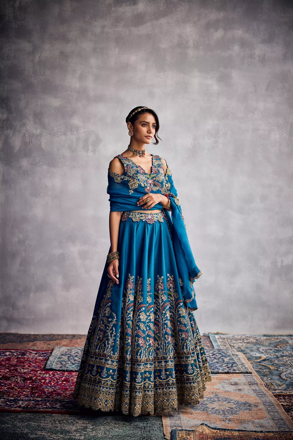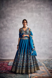 Blue lehenga set with gold and silver embroidery highlighted with various embellishments. Paired with embroidered blouse and dupatta.